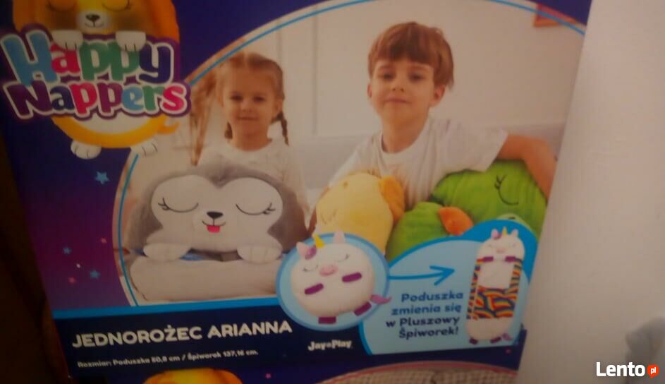 Idealne na zabawę oraz drzemkę, w każdej chwili! Bawią się z tobą przez cały dzień i są idealne również na nocowanie! Każdy Happy Napper jest wspaniałym przyjacielem, którego możesz zabrać ze sobą wszędzie. Możesz bawić się z nim przez cały dzień a później łatwo się zdrzemnąć!Idealna poduszka do zabawy! Kiedy nadejdzie pora snu, wystarczy pociągnąć za nogi, aby odsłonić przytulny śpiworek. Po zakończeniu drzemki łatwo się składa i jest zabezpieczony dwoma zatrzaskami na guziki.