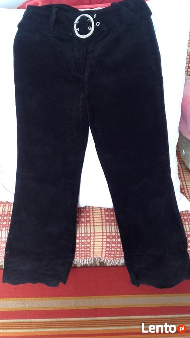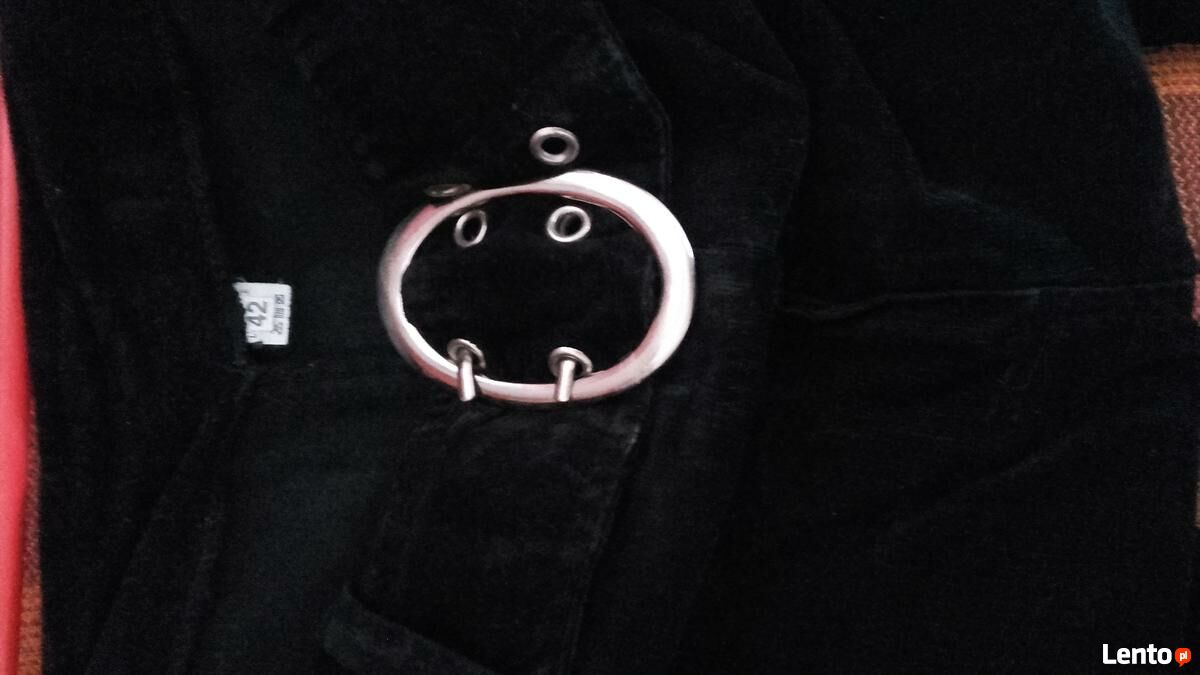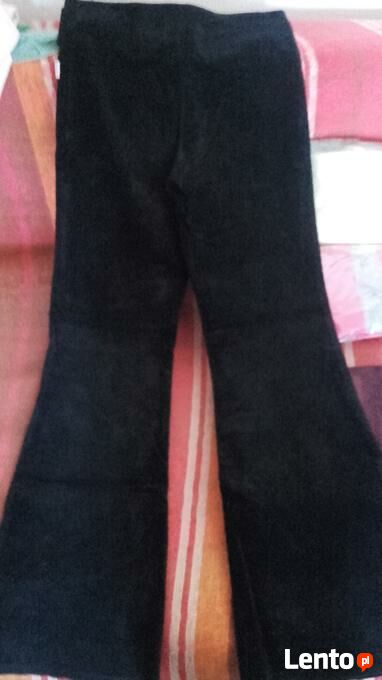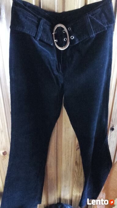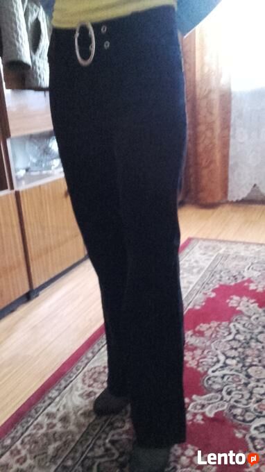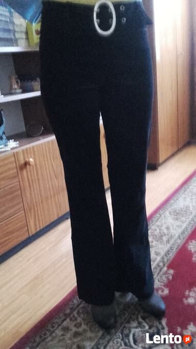Sprzedam spodnie sztruksowe damskie w kolorze czarnym z ozdobnym paskiem-klamrą. Rozszerzne u dołu, modne w tym sezonie dzwony. Materiał bardzo miły w dotyku i cieplutki. Spodnie w bardzo dobrym stanie. Zdjęcia niestety nie oddają wyglądu, na żywo kolor jest intensywno czarny. Na metce rozmiar 42 w rzeczywistości może się różnić, więc dla zainteresowanych dokładne wymiary podam na priv. Cena 25zł oczywiście do negocjacji.Renata