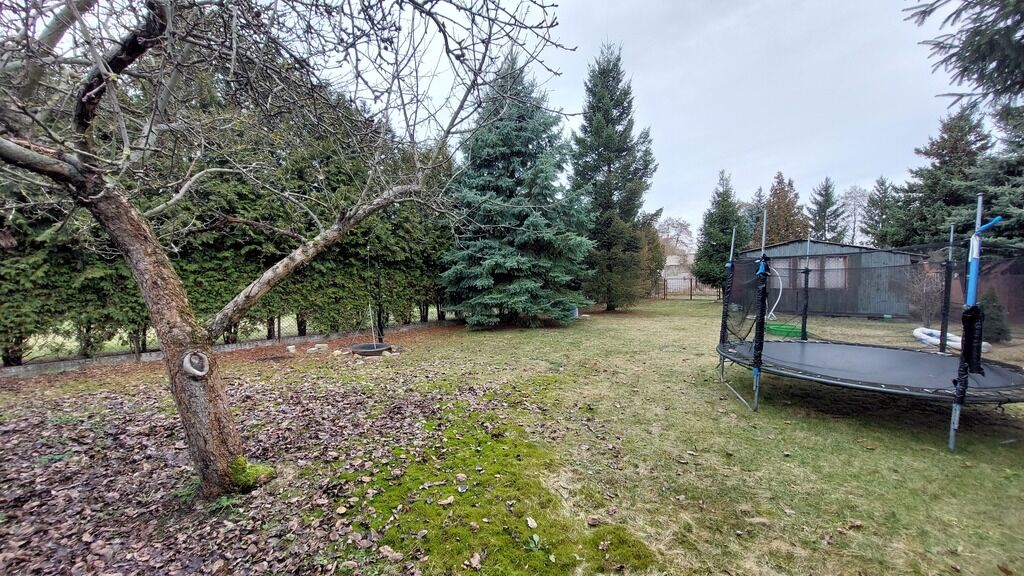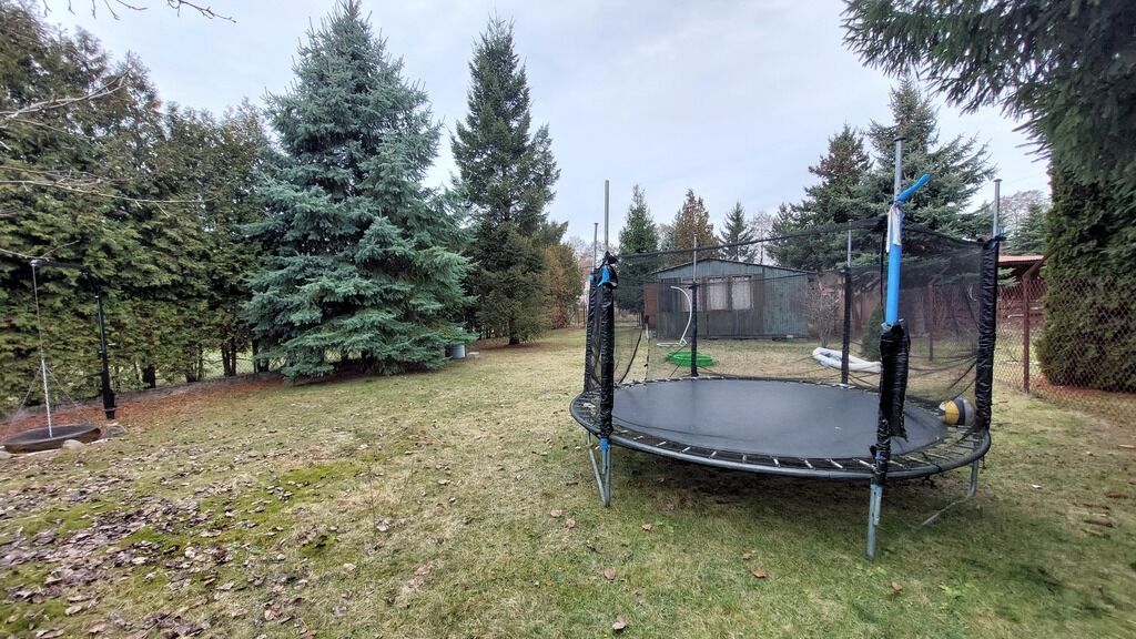 działki rosną drzewa iglaste oraz znajduje się zadbany trawnik, co