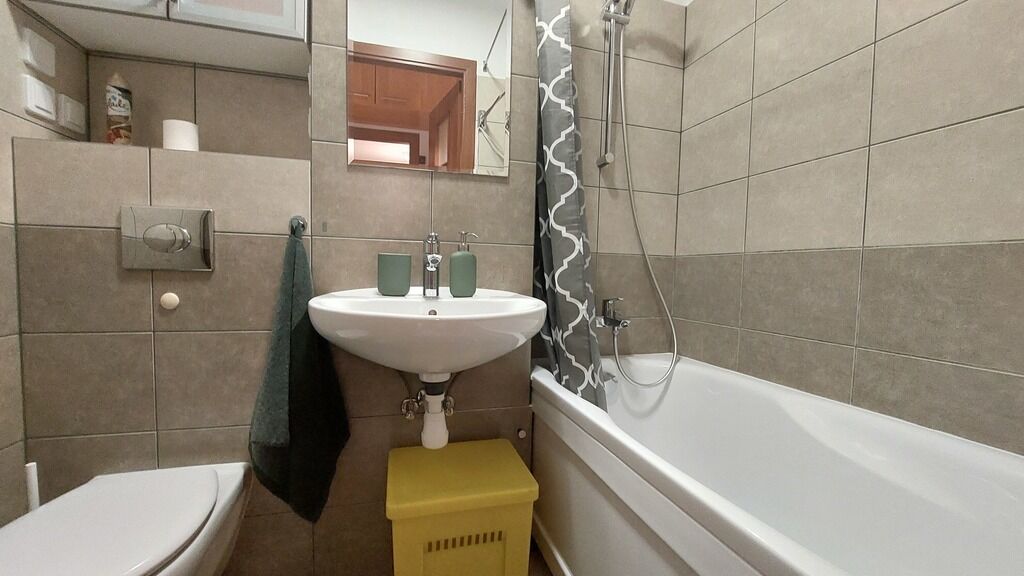 W łazience znajduje się wanna z funkcją natrysku, toaleta, umywalka
