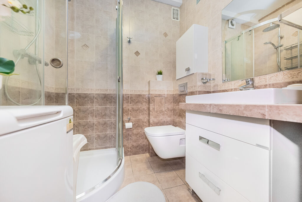 kabinę prysznicową, pralkę, WC oraz umywalkę z szafką. W