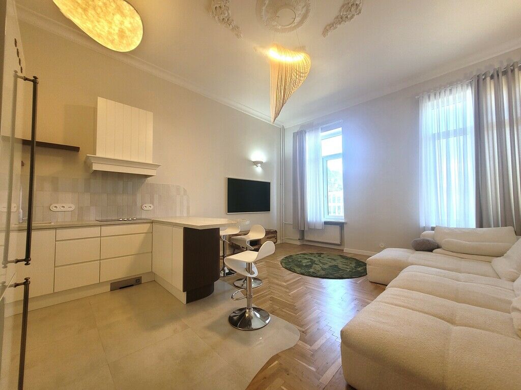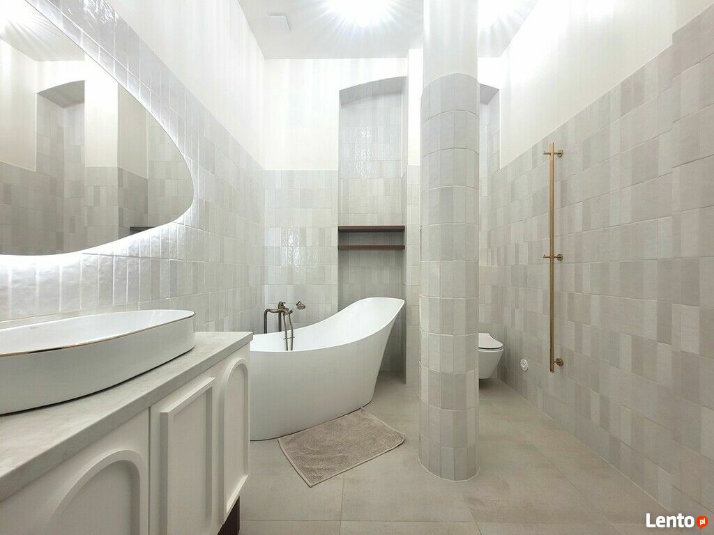 pięknego salonu z aneksem kuchennym oraz łazienki z wanna. Ogromnym