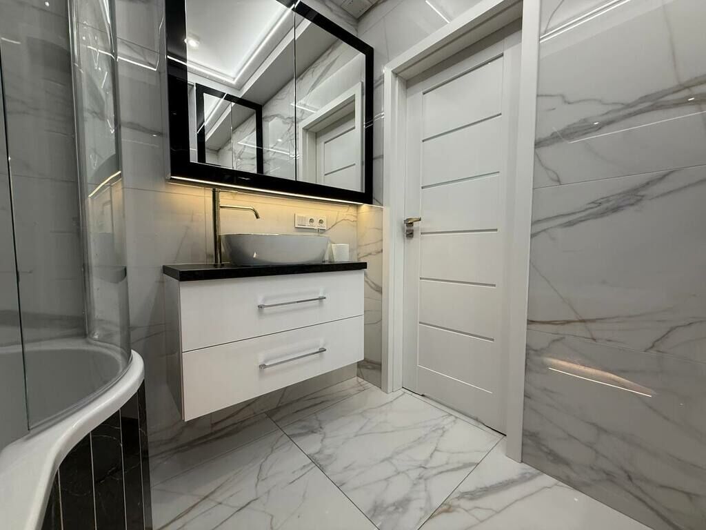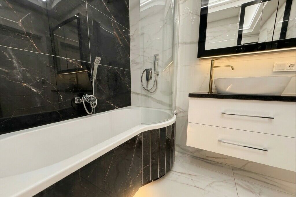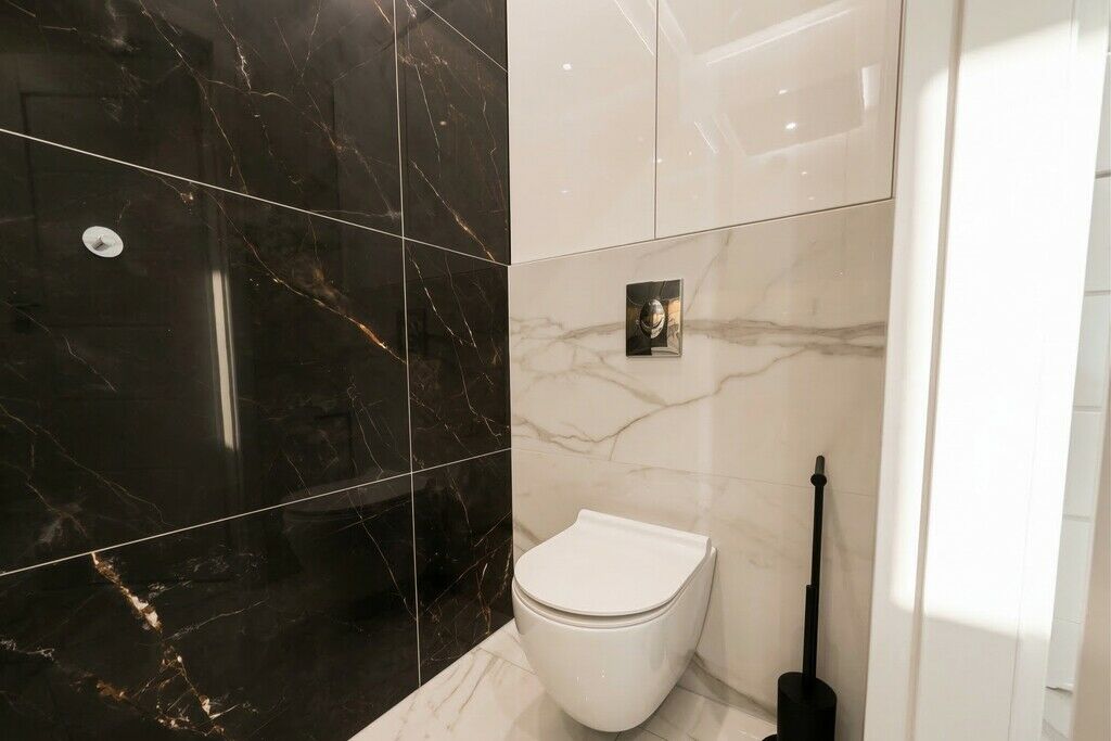 standardzie z użyciem gresu imitującego biały i czarny marmur.