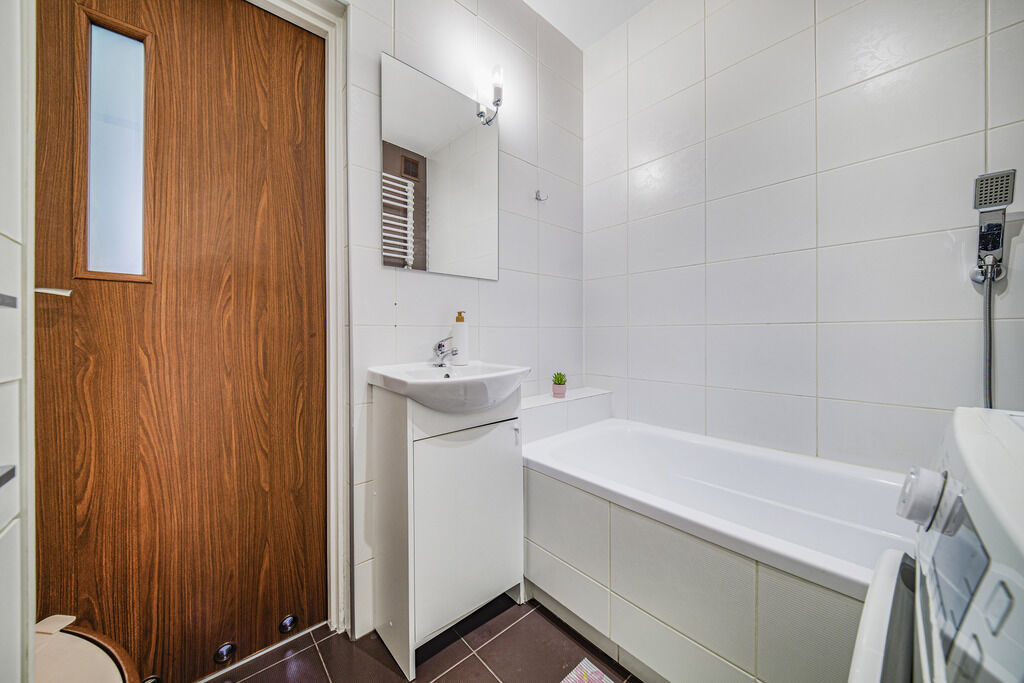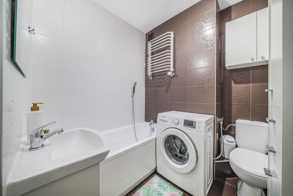 Łazienka z wanną mieści również umywalkę, toaletę, pralkę oraz