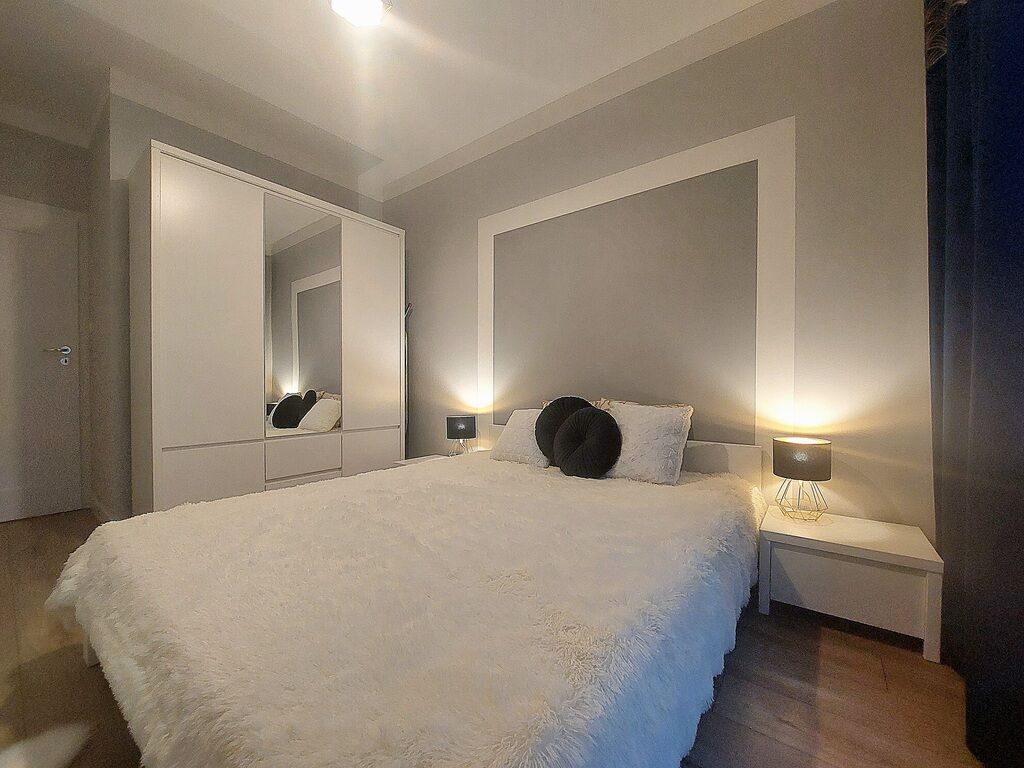 - sypialnia - utrzymana w odcieniach bieli i szarości, z granatowymi