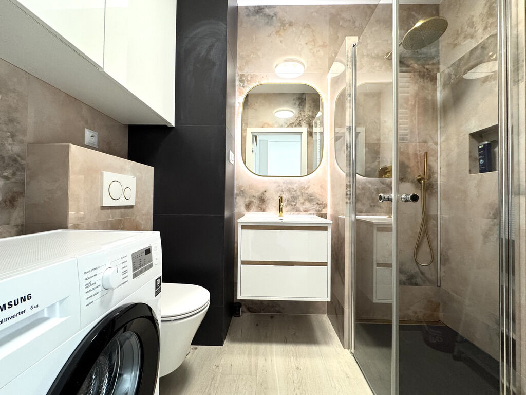 zabudowie, łazienki wyposażonej w prysznic, toaletę, umywalkę i