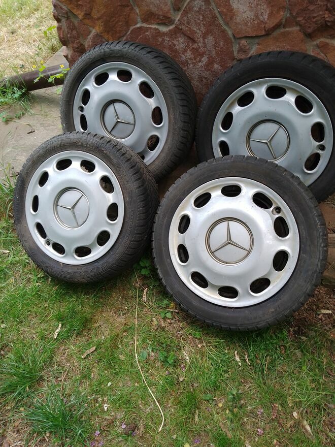 koła z oponami zimowymi do Mercedesa A klasa, rozmiar 2 x 195/50 R 15 Good Year, , 2 x 185 /55 R 15 Michelin. Oryginalne kołpaki. Głęboki bieżnik. Cena 400 zł.Karol
