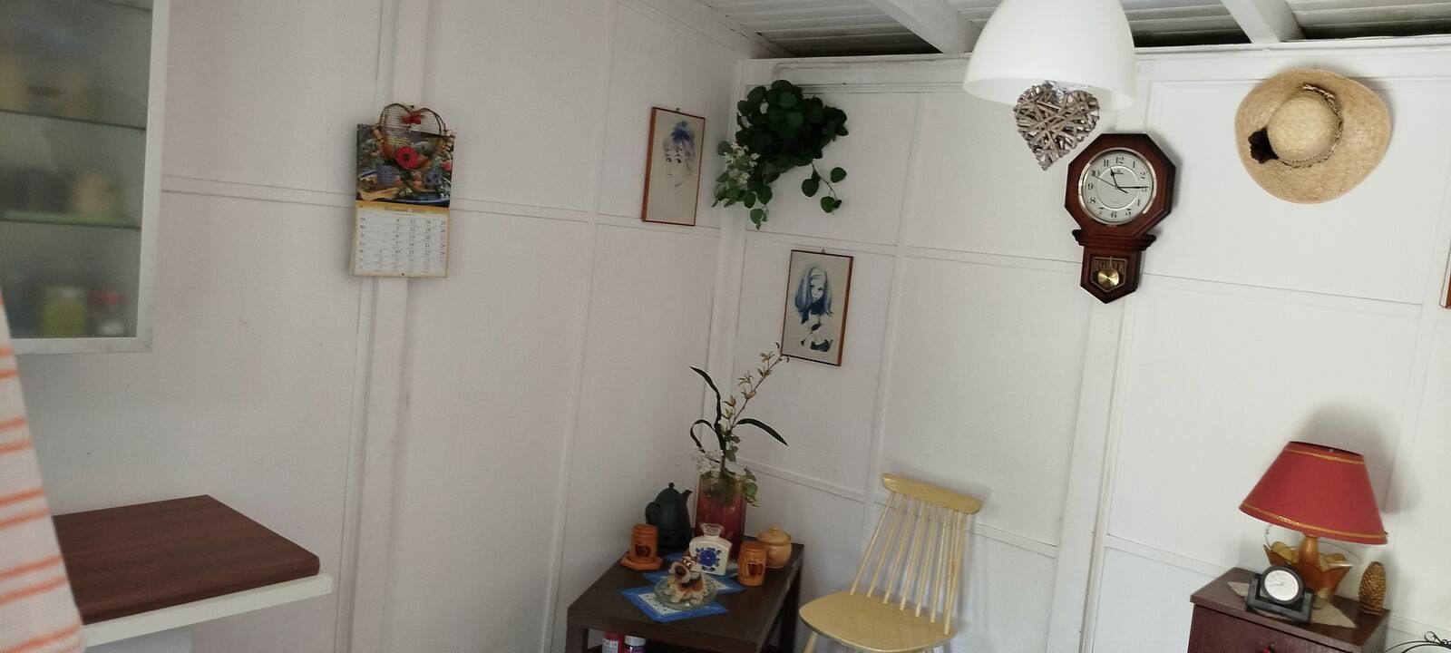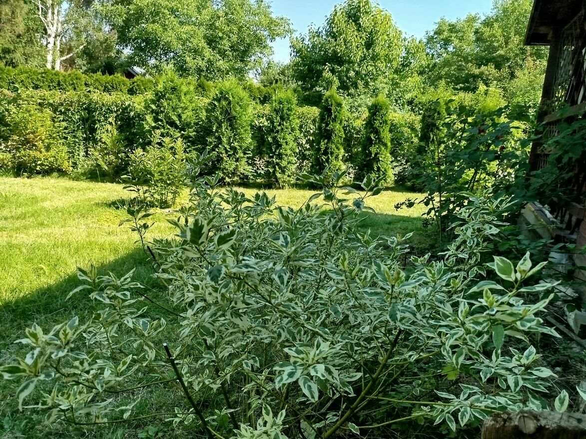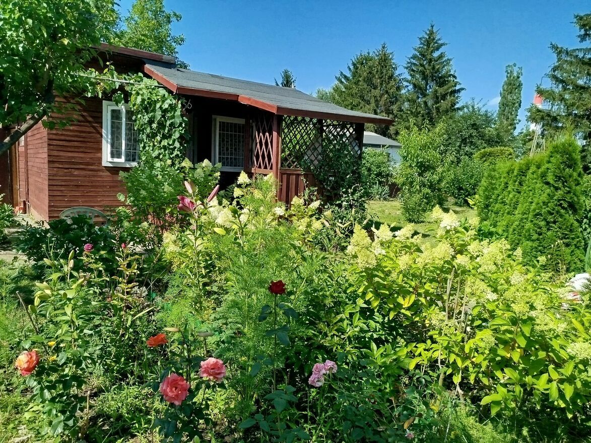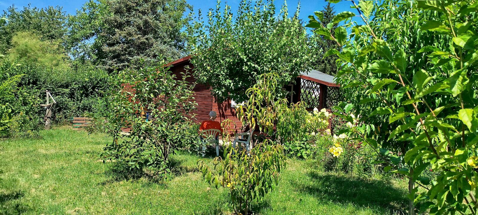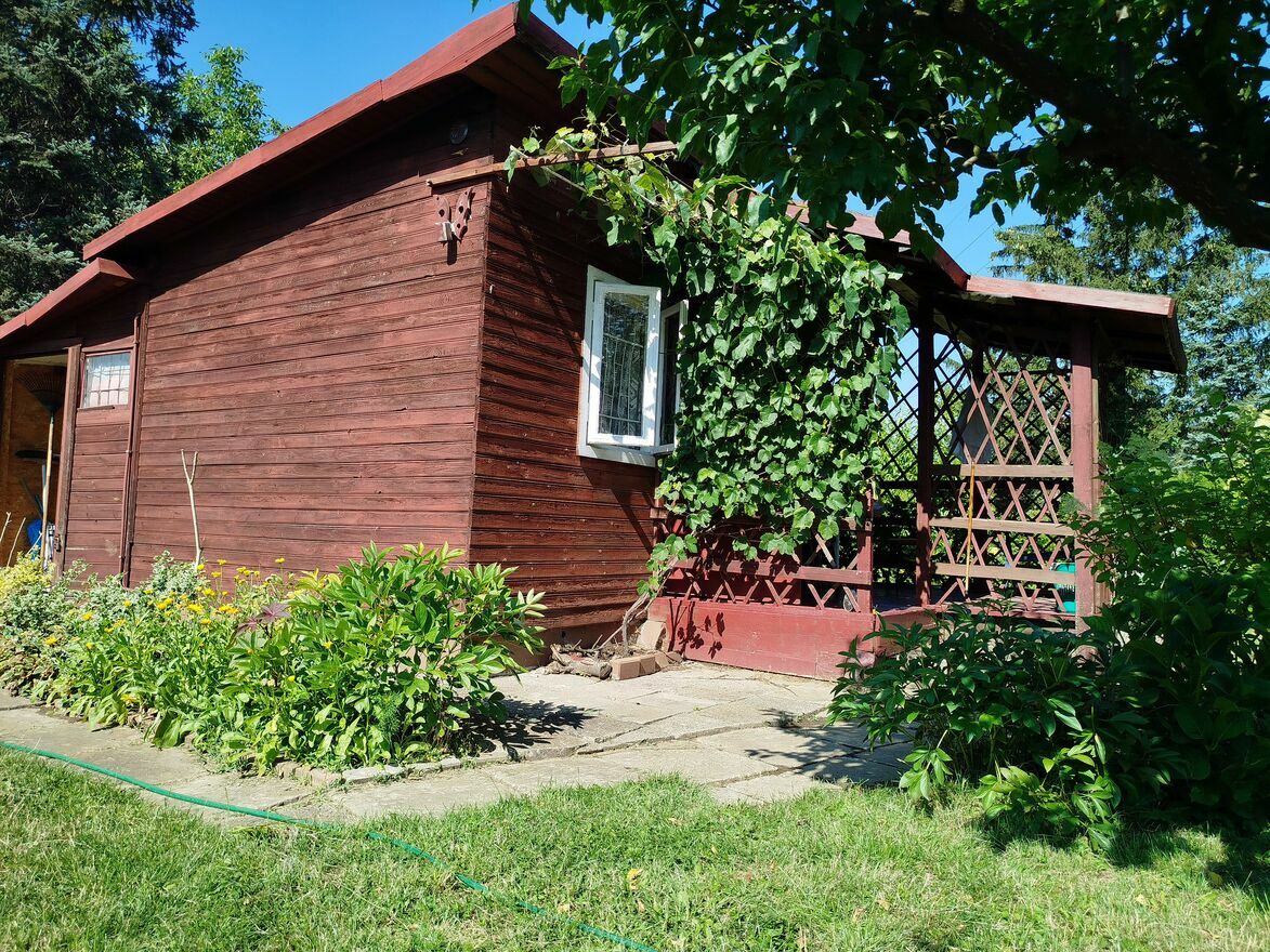 ⦁ Domek drewniany letniskowy 27 m2 z dwoma pokojami, podpiwniczony, z tarasem, w oknach są kraty;
