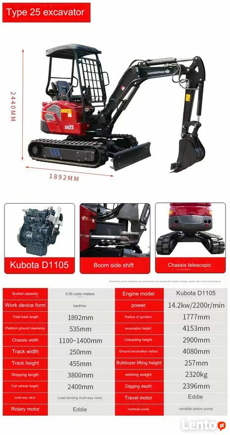Na sprzedaż: Nowa koparka gąsienicowa!Oferuję małą koparkę w idealnym stanie, wyposażoną w niezawodny silnik Kubota 1105. Koparka posiada zmienny układ hydrauliczny wrażliwy na obciążenie, co zapewnia płynność i precyzję pracy. Podwozie teleskopowe umożliwia regulację szerokości od 1 m do 1,27 m, co pozwala na pracę w wąskich przestrzeniach. Dodatkowo, koparka wyposażona jest w funkcję bocznego obrotu, co zwiększa jej wszechstronność.