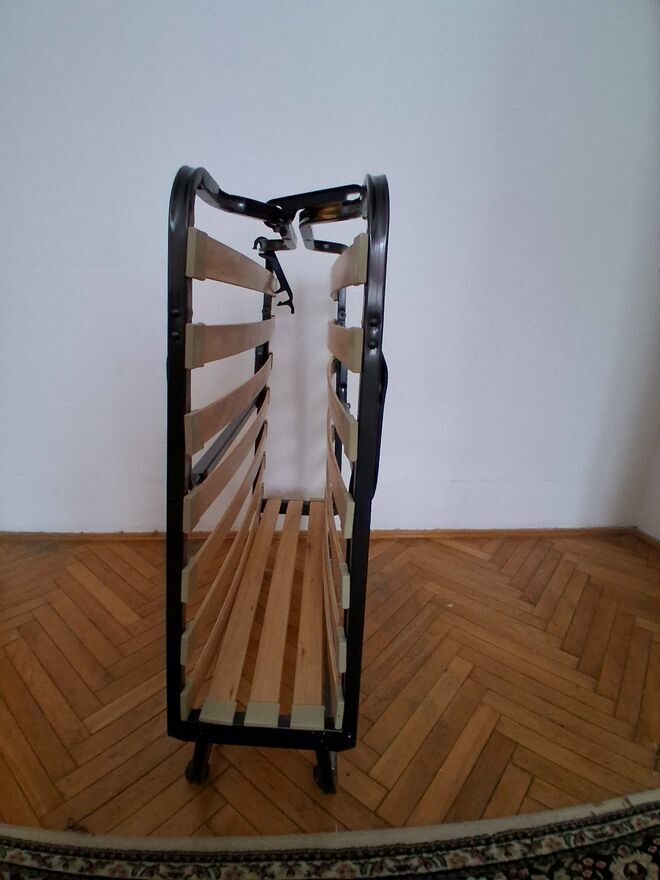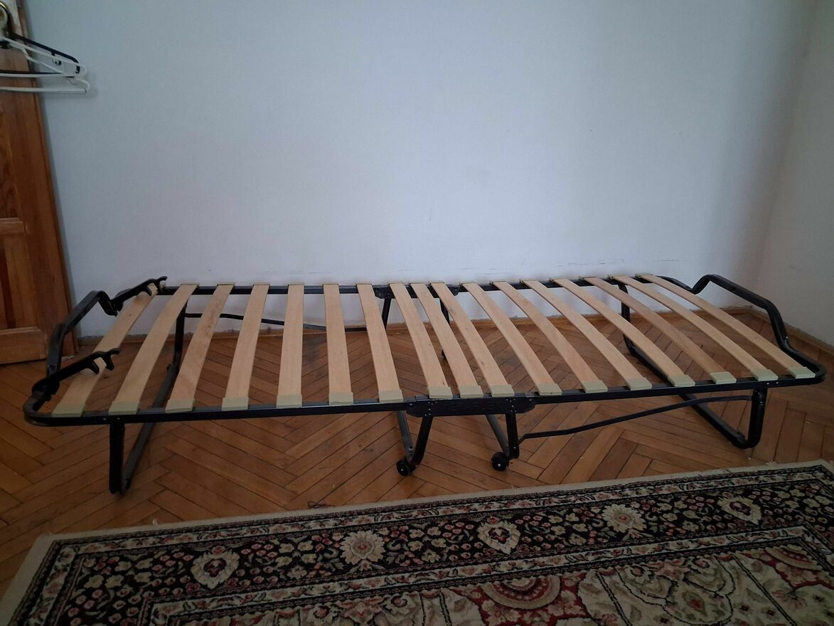Sprzedam łóżko składane - stelaż (bez materaca). Łózko było użytkowane, jest w bardzo dobrym stanie:Długość: 200 cm, szerokość: 91 cm, wysokość: 27cm. Jest składane, jak na zdjęciu, ma kółeczka, łatwe w transporcie.