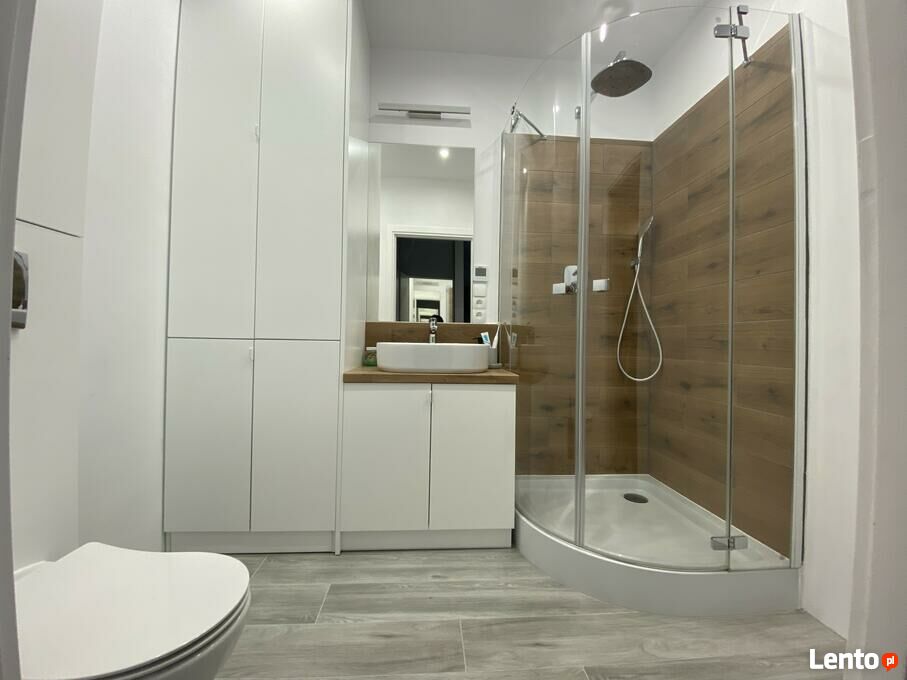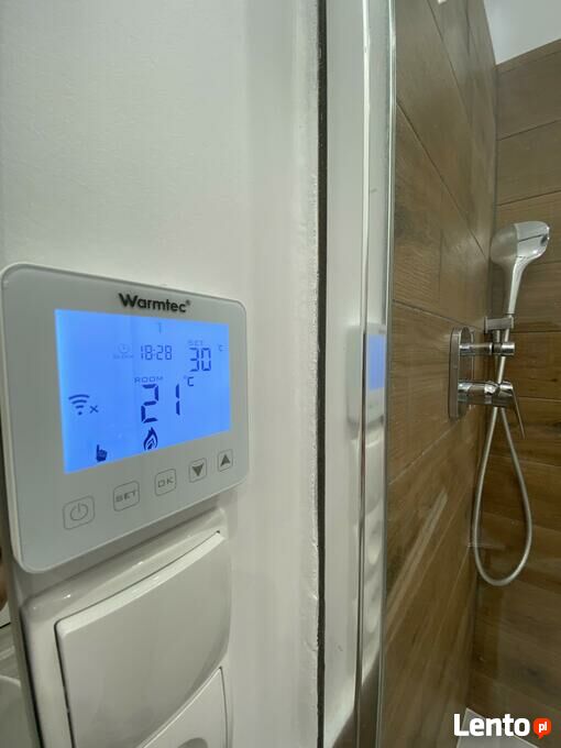 - Łazienka z prysznicem, szafami do przechowywania zrobionymi pod wymiar oraz ogrzewaniem podłogowym;
