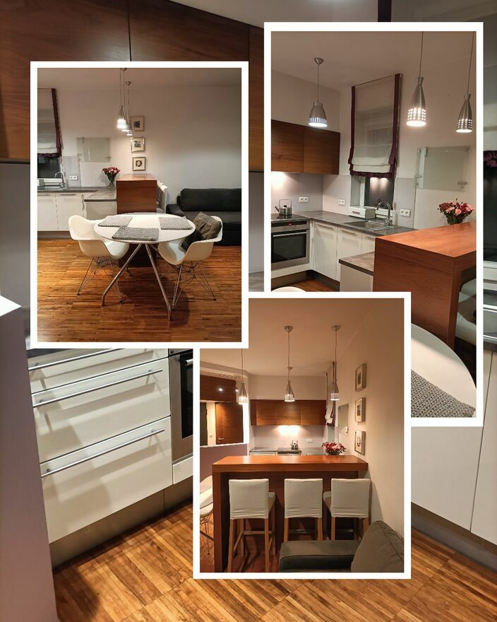 Kuchnia w formie przestronnego aneksu. Okno kuchenne wychodzi na wschód a w salonie i sypialni na południe. Naturalnym przedłużeniem salonu jest ponad 20 metrowy taras wykończony naturalnym drewnem i z tego samego naturalnego materiału donic. Zaaranżowana zieleń zapewnia większą intymność oraz dodaje przyjemnego uroku. Taras jest w pełni umeblowany w drewniana leżankę, stół oraz 4 krzesła z drewna egzotycznego oraz wiszący fotel. Taras optycznie sprawia, że mieszkanie ma dodatkową przestrzeń do życia. Można otworzyć 2 drzwi okiennych ( od podłogi do sufitu). Cała południowa część salonu przeszklona, co zapewnia cudowne nasłonecznienie i przyjemną energię w ciągu dnia. Na tarasie pijąc poranną kawę budzi nas przyjemnie wschodzące słońce, a popołudniu nagrzewa zachodzące. Sypialnia sąsiaduje z pokojem i pozwala także na wyjście na taras przez duże przeszklone drzwi. Okna od podłogi do sufitu zapewniają dużą ilość światła. Zabudowa szaf i regału zaprojektowana indywidualnie pozwala na wykorzystanie każdego w pełni pomieszczenia. Przestrzeń powiększają przesuwne podwójne drzwi chowane w kasetony w ścianie. Część dzienna oraz łazienka i hol wykończona jest olejowanym teakiem egzotycznym, natomiast sypialnia przyjemną wykładziną.