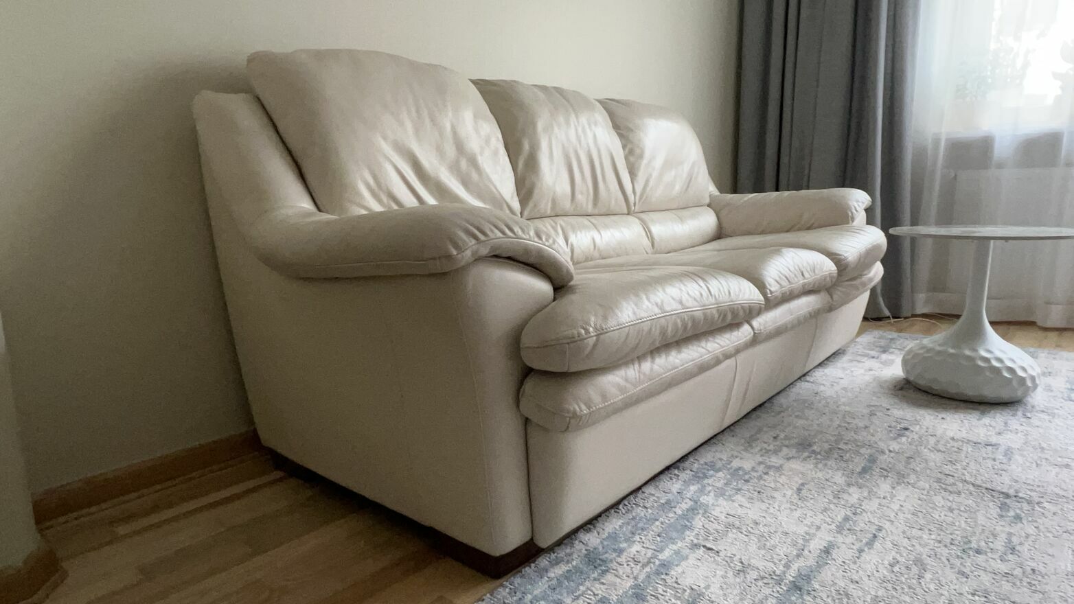 Marka NATUZZI. Model to połączenie stylu oraz funkcjonalności. Szerokie podłokietniki oraz siedziska sofy zapewniają najwyższy komfort użytkowania.Wygodna, skórzana sofa w kolorze białym. Mebel jest w bardzo dobrym stanie, nadaje się do użytku w salonie lub pokoju dziennym. Sofa zapewnia komfort i elegancki wygląd, pasując do różnych stylów aranżacji wnętrz.