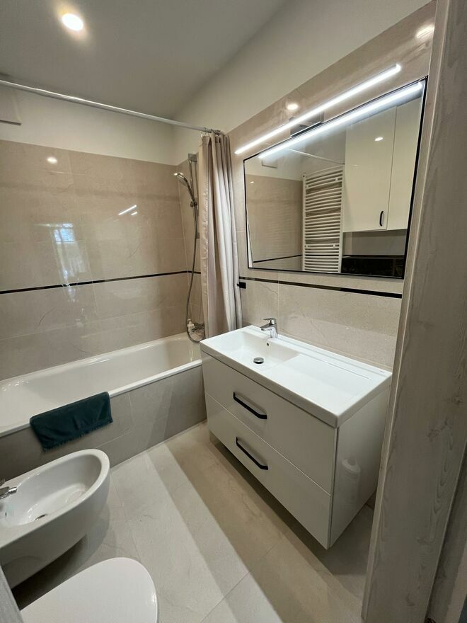 - Dwie łazienki – jedna z wanną, druga z kabiną prysznicową