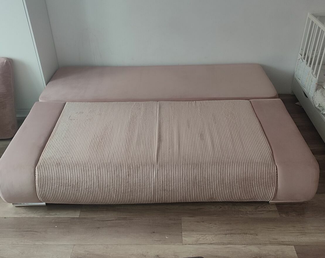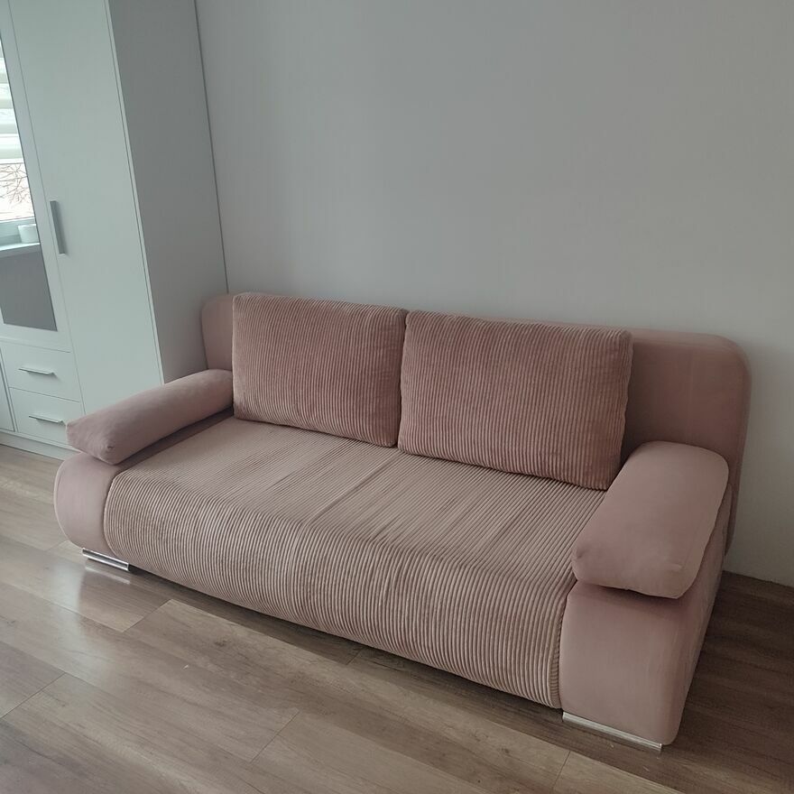 Sprzedam sofę używaną zakupioną rok temu. Podaje opis ze strony zakupu: Wygodna sofa w kolorze różowym z pionowymi prążkami, idealna do salonu. Posiada pojemnik na pościel. Ernas to model sofy, który cieszy się ogromną popularnością wśród klientów Mirjan24, natomiast kanapa do salonu Ernas Szruks to jej odświeżona wersja, która odpowiada na aktualne trendy wnętrzarskie. Do wykonania tego modelu zostały wykorzystane wstawki z tkaniny, której struktura nawiązuje do ponadczasowego i stylowego sztruksu.Dodatkowym atutem kanapy jest funkcja spania. Natomiast zapasową pościel przechowasz w pojemniku, który mieści się w skrzyni pod siedziskiem.