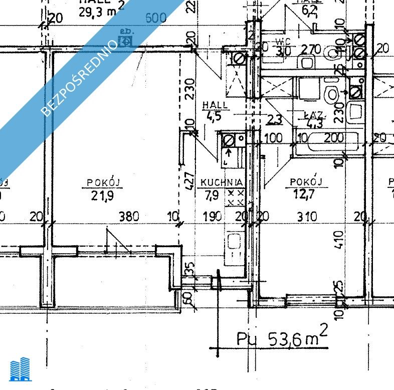 Powierzchnia użytkowa lokalu 53,6 m2. Pokój : 21.9 m2 , pokój : 12,7 m2, Kuchnia : 7.9 m2 (aneks, możliwe oddzielenie ścianką), łazienka: 4.3 m2 , hall główny: 4.5 m2 , hall boczny: 2.3 m2, loggia.