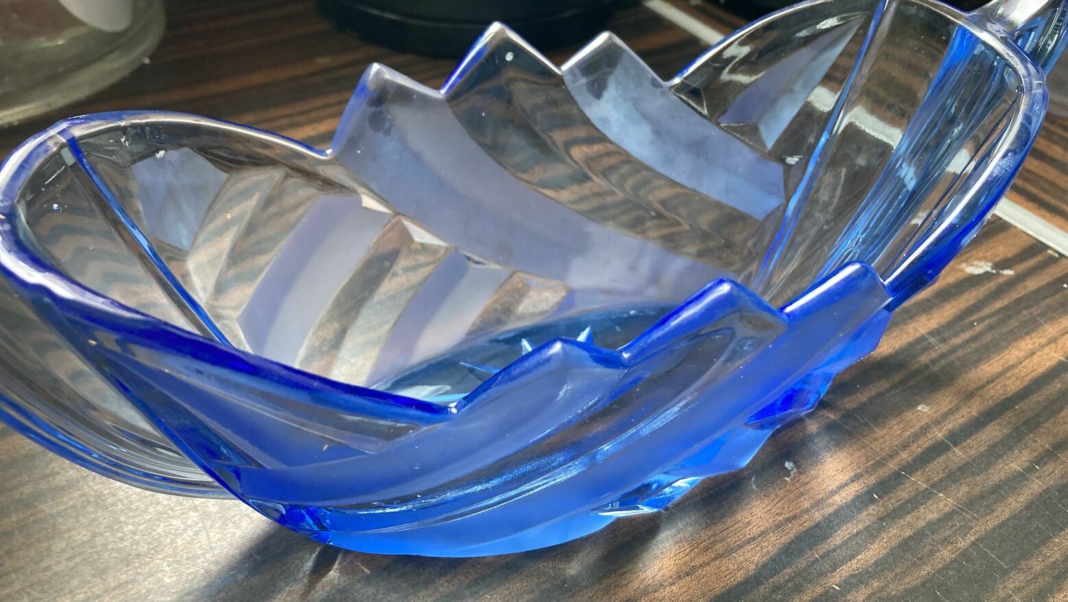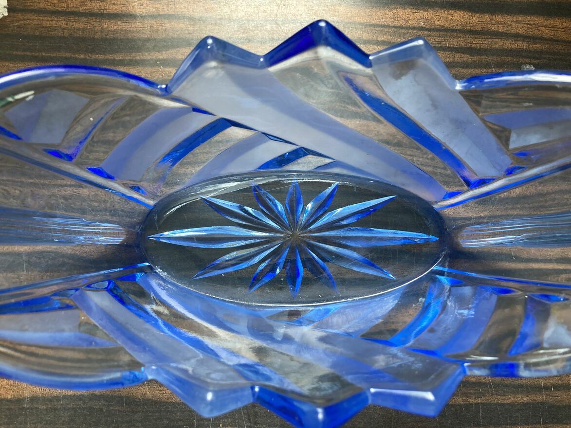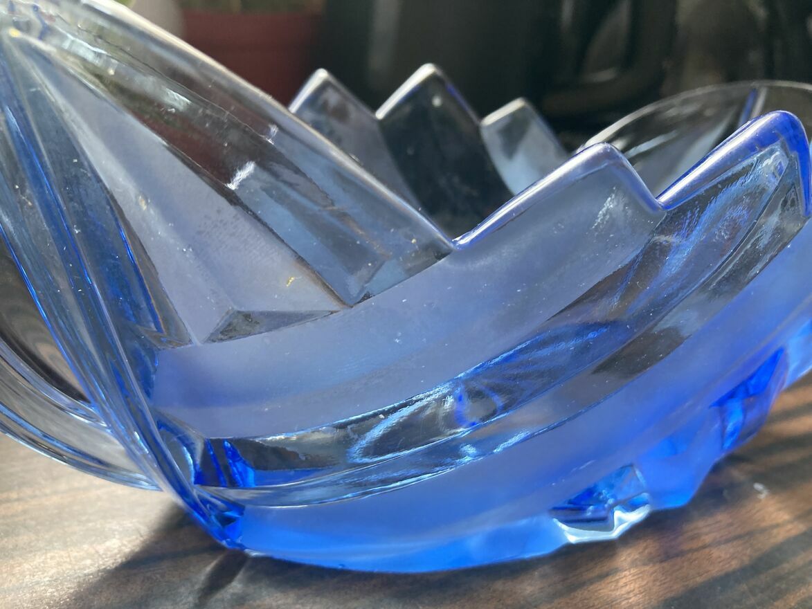 Szklana żardiniera w stylu Art Deco, wyprodukowana w Hucie „Niemen” w Brzozówce w latach 30-tych XX wieku.Szkło prasowane, częściowo matowione, barwione na kolor niebieski.