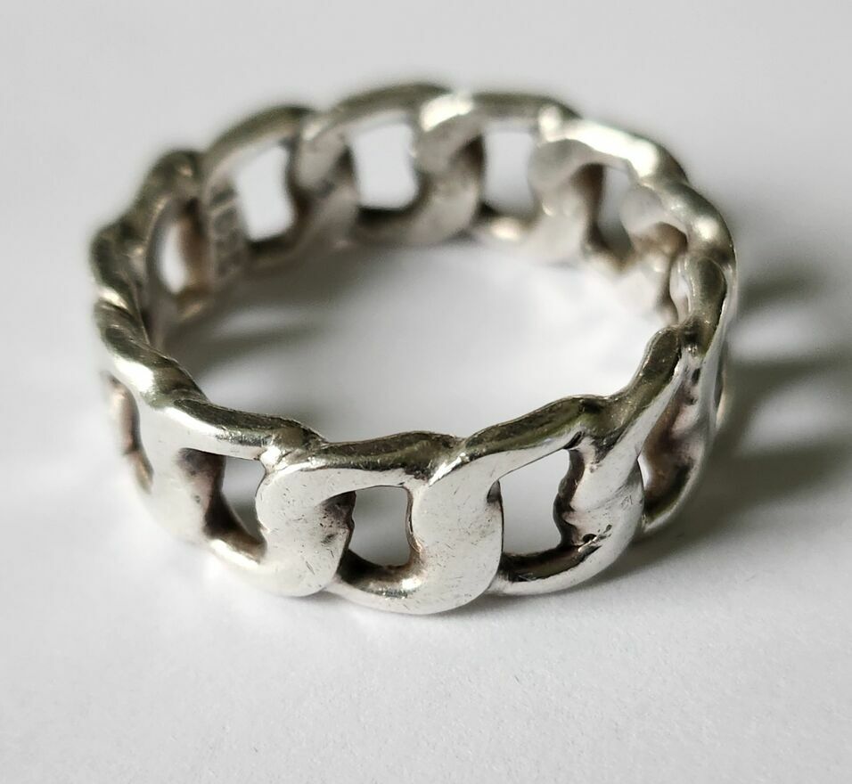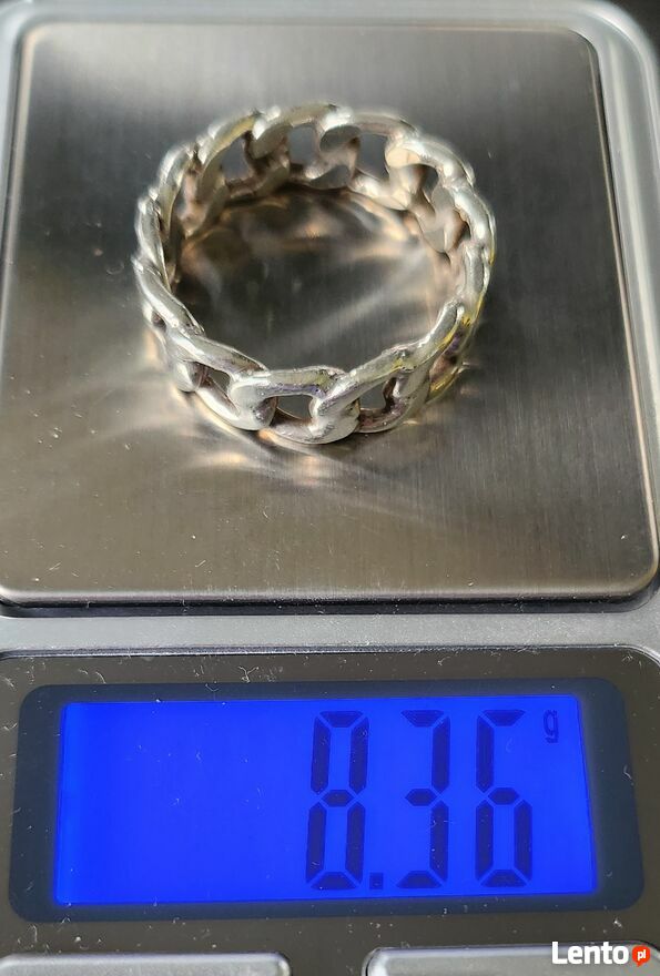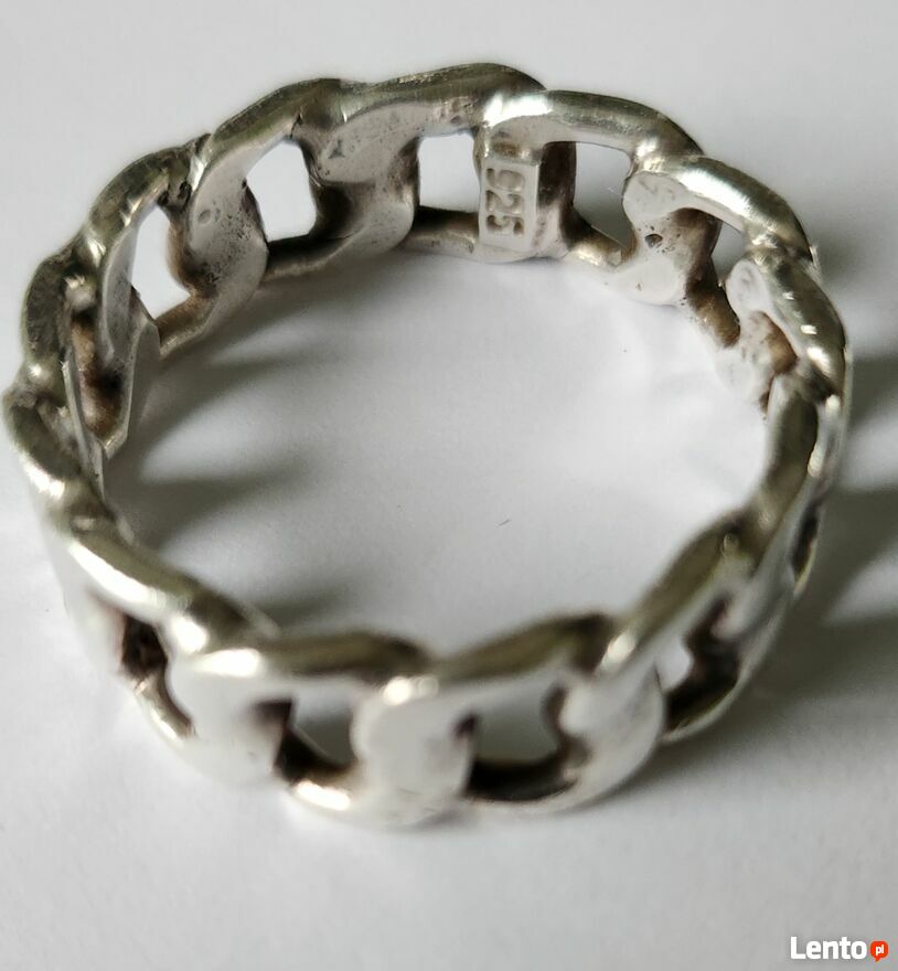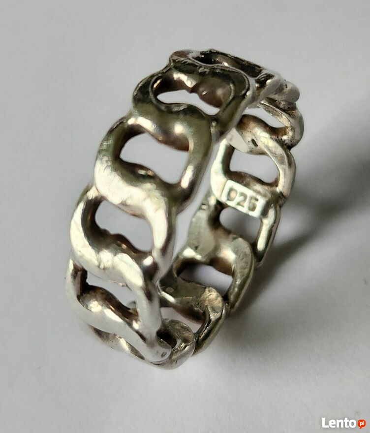"ogłoszenie widoczne = AKTUALNE"Srebrny pierścionek / obrączka wzór pancerka, próba 925, waga 8,36 grama, średnica wewnętrzna 22 mm, szerokość 8 mm.