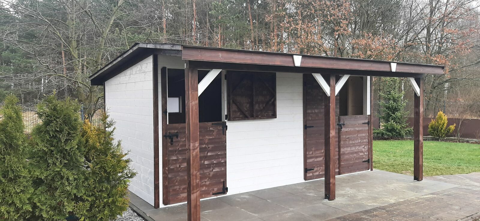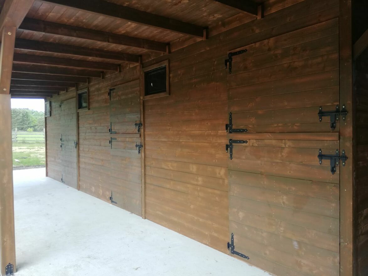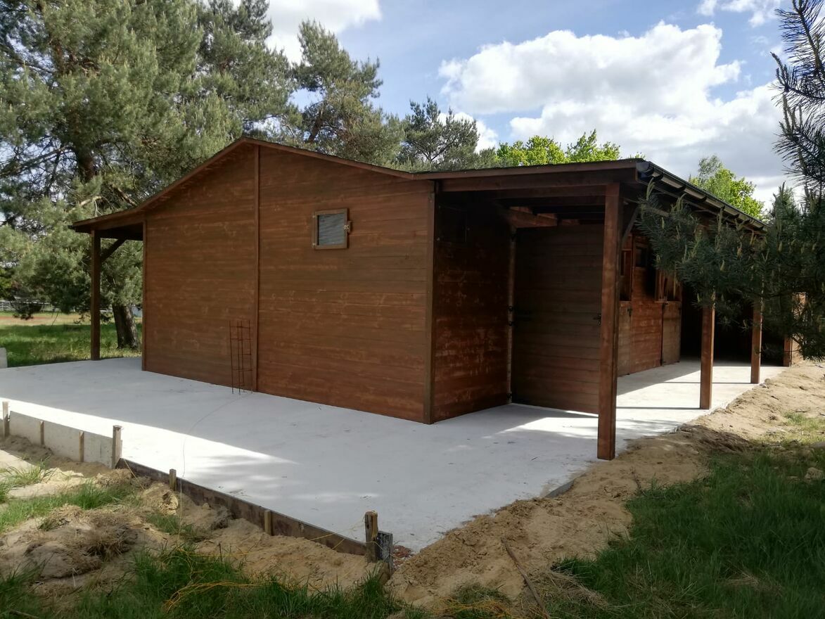 * Stajnia drewniana pokryta z zewnątrz dwoma warstwami impregnatu drewnochronu express w wybranym kolorze: dąb, jasny dąb, ciemny orzech, średni palisander, tik lub kasztan.