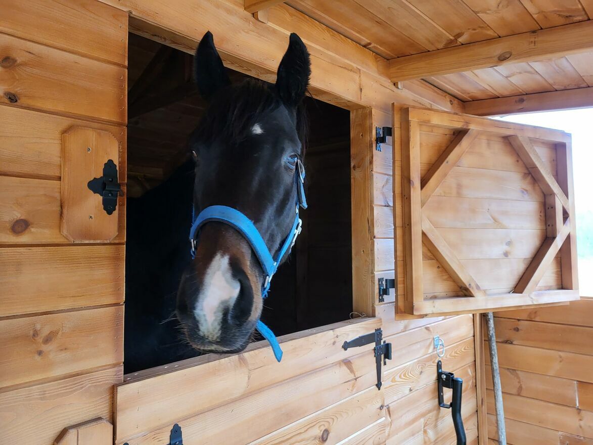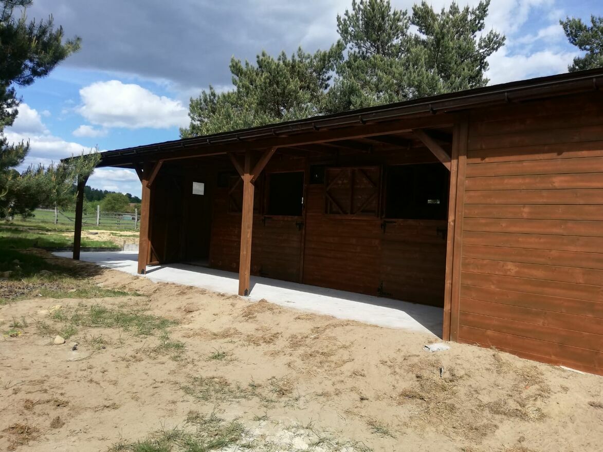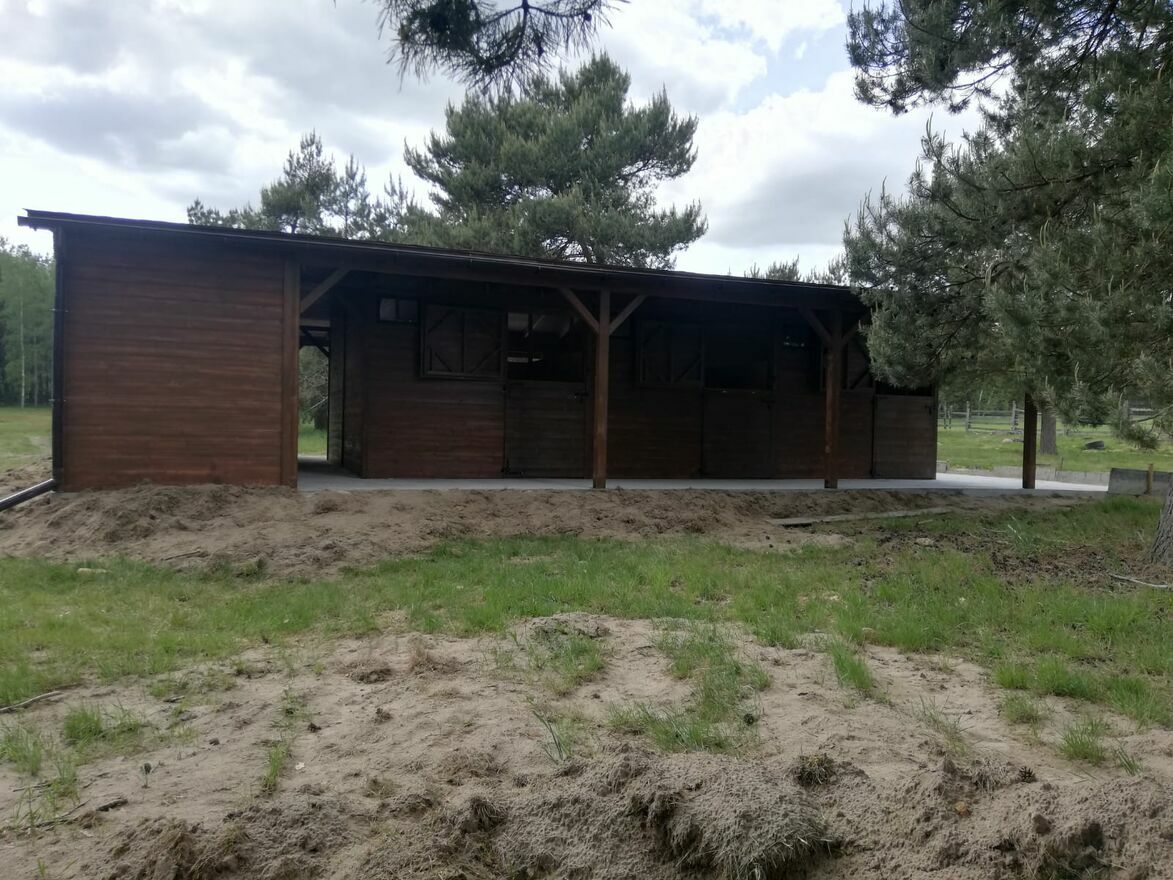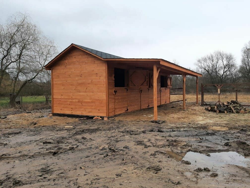 - Stajnię 3 m x 8 m × 2,1 m wys. [2 boksy o wymiarach 3 m x 3 m i pomieszczenie socjalne/mały boks o wymiarach 2 m x 3 m] pokrytą gontem bitumicznym. Wys. ścian bocznych ok. 2,1 m.