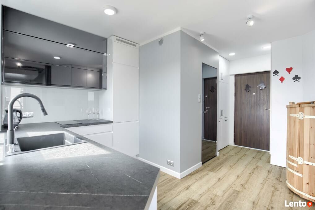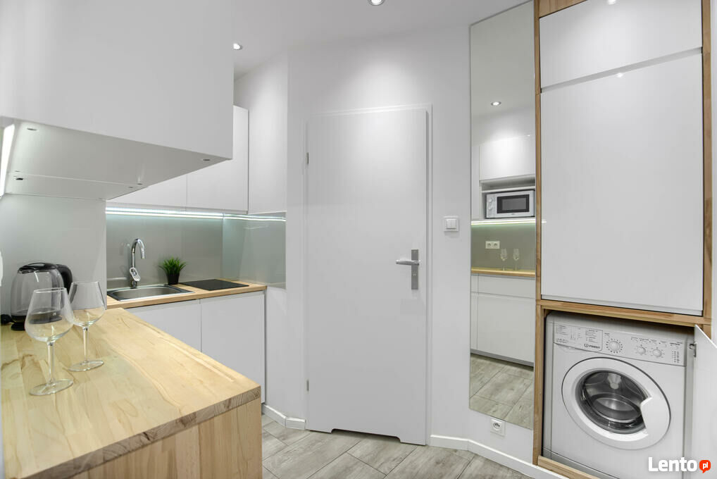 • ciekawie wkomponowanej kuchni (kompletnie wyposażonej), z której pijąc kawę można podziwiać narciarzy na Górce Szczęśliwickiej