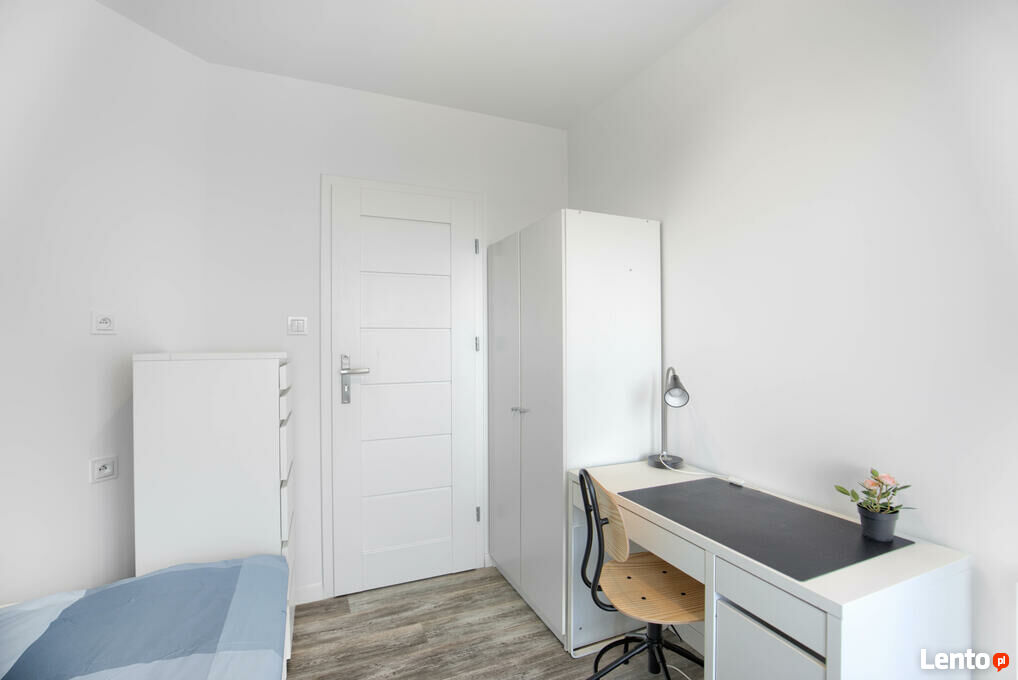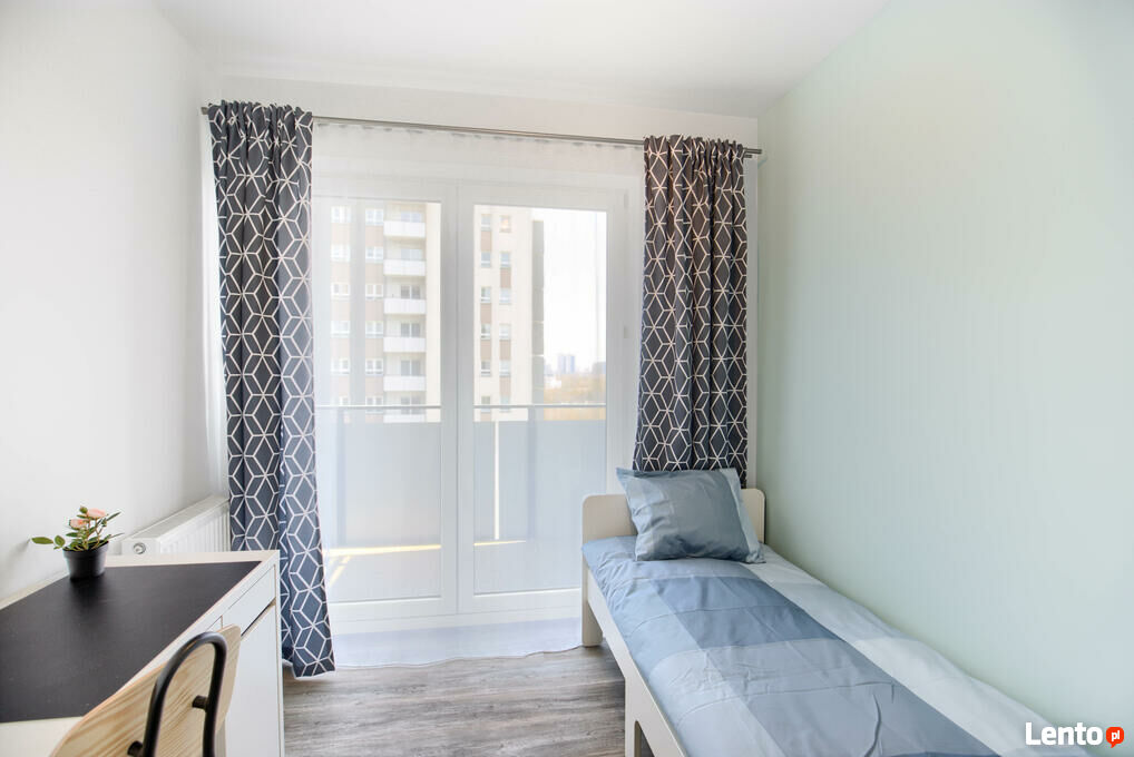 • 3 nieprzechodnich, samodzielnych pokoi (jeden z balkonem) zamykanych na klucz (drzwi bez przeszkleń) – każdy pokój wyposażony w łóżko z szufladą na pościel (z pościelą), szafę, komodę, biurko z szafką i lampką, 2 lampy, fotel, 6 gniazdek elektrycznych w każdym pokoju • 1 kompletnej łazienki do wspólnego korzystania (WC, prysznic z odpływem liniowym, umywalka, duże lustro)