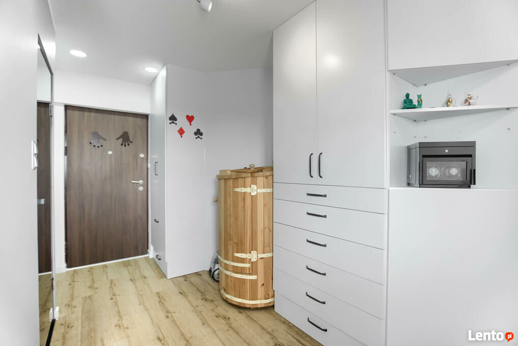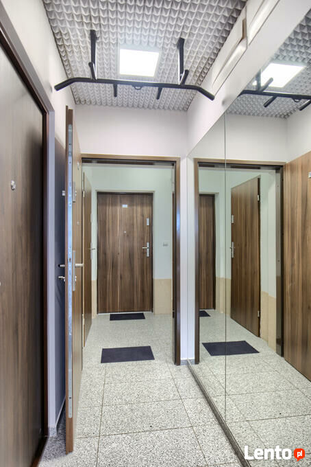 Do obu mieszkań prowadzi jeden wspólny korytarz wyłożony lustrami, optycznie powiększający powierzchnię, z którego dostajemy się do obu mieszkań niezależnie. Pod sufitem sprytnie zamontowano drążek do podciągania się, który w towarzystwie luster daje namiastkę maleńkiej siłowni.