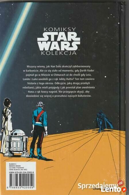 Komiks Star Wars Kolekcja Legendy Klasyczne Opowieści 5 - NOWE W FOLII Tytuł: Star Wars Kolekcja Legendy Klasyczne Opowieści 5 Autor: Praca zbiorowa Okładka: twarda Liczba stron: 192 Star Wars Klasyczne Opowieści 5 - Wszyscy wiemy, jak Han Solo skończył zahibernowany w karbonicie. Ale co się stało od momentu, gdy Darth Vader pojmał go w Mieście w Chmurach aż do chwili gdy Leia, Lando i Luke uwolnili go z rąk Jabby Hutta? Ten tom zawiera historie z tego okresu. Odkryjcie, jaką drogę przebyli rebelianci, jakie mieli przygody i jak powstał plan uwolnienia Hana z rąk łowcy nagród. Nie przegapcie okazji, aby dowiedzieć się więcej o przeszłości naszych bohaterów. Karton 79 Ogłoszenie jest aktualne dopóki znajduje się na stronie . Odbiór osobisty lub wysyłkaSprawdź zainteresowanie tym ogłoszeniem
