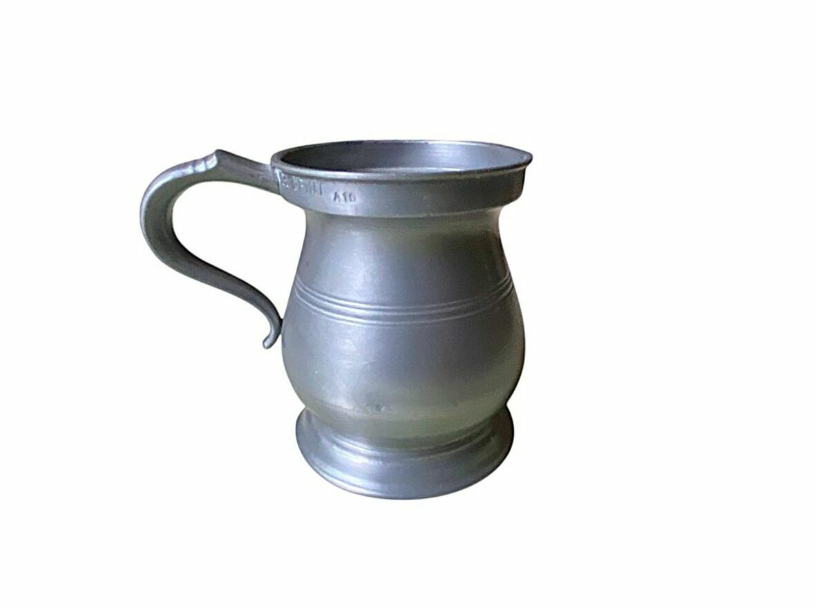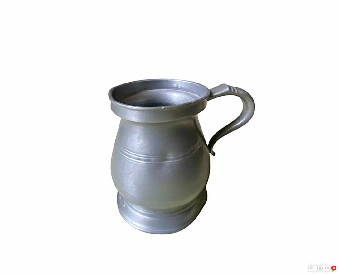 Stary kufel ze stopu cyny o pojemności 1/2 pinta, z czytelnymi oznaczeniami,posiada lekkie zagięcia widoczne na załączonych zdjęciach,