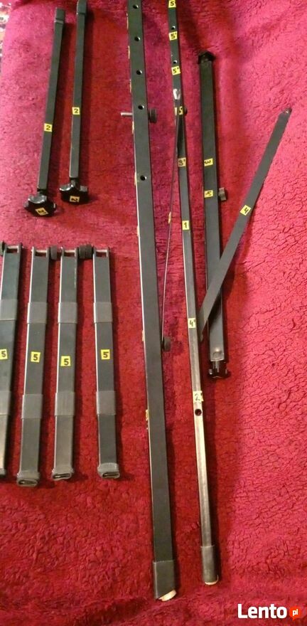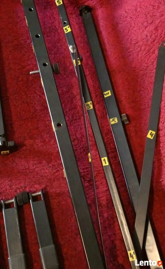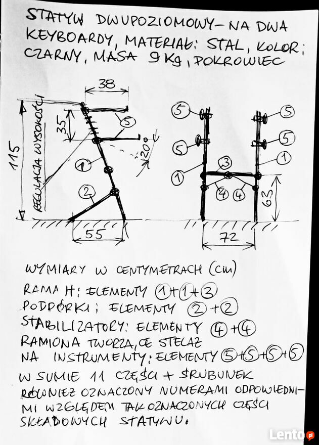 całość w firmowym pokrowcu, łatwa do transportu. Oprócz informacji producenta dołączam odręczny szkic z podaniem wymiarów (z natury) statywu, w celu lepszej orientacji. Na fotografiach z instrumentami prawie go nie widać. Wszystkie części posiadają łatwo usuwalne naklejki z numerami ułatwiające montaż. Proponowana cena 500 zł. Preferowany odbiór osobisty.