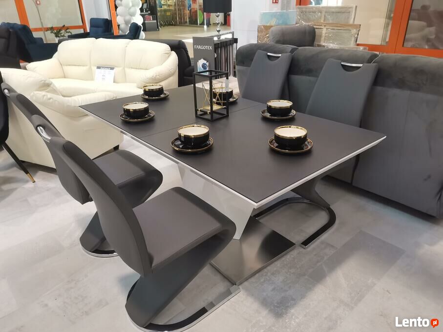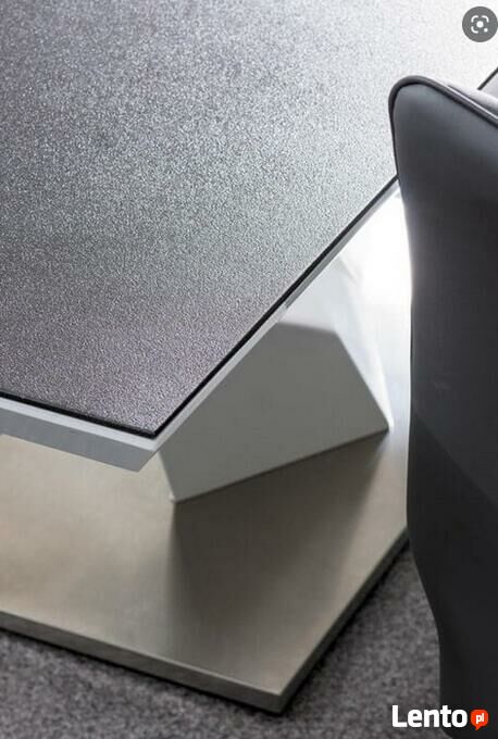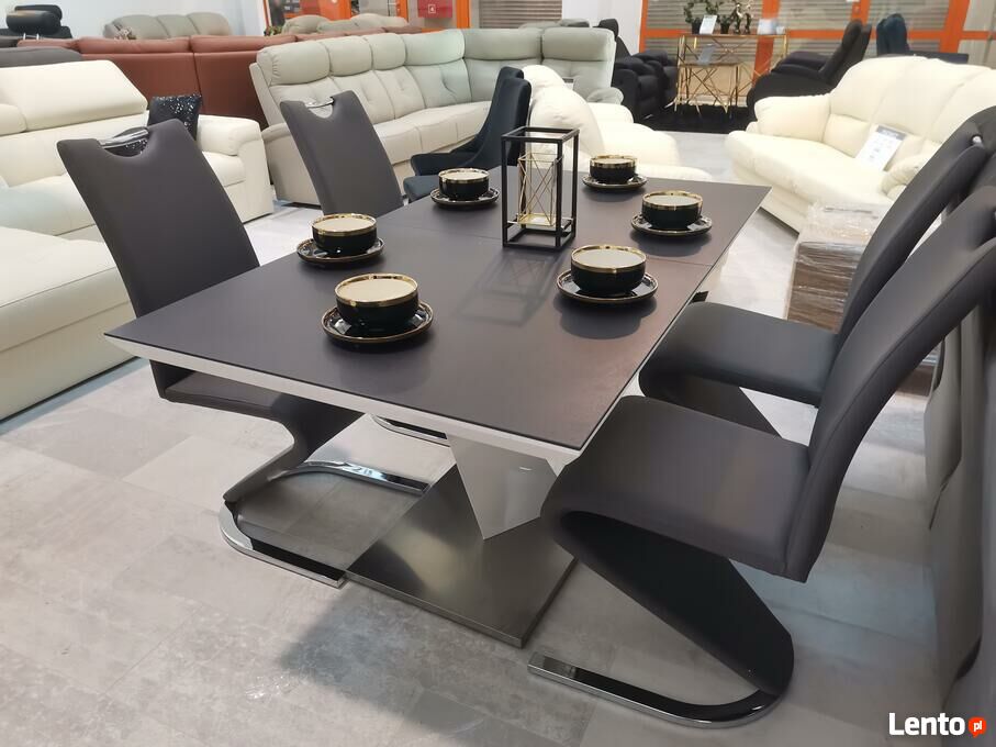 Stół: MDF + szkło hartowane + stal szczotkowana