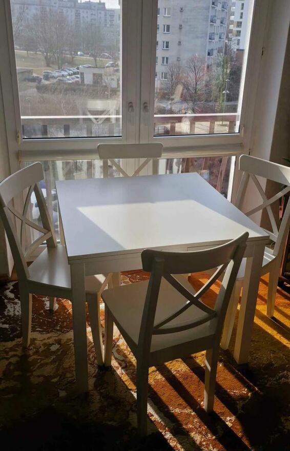 Sprzedam drewniane meble IKEA. Zestaw do jadalni, kuchni, mieszkania lub na działkę.Stół WYMIARY 90cm×90cm, po rozłożeniu 129cm lub 168cm. Kolor biały