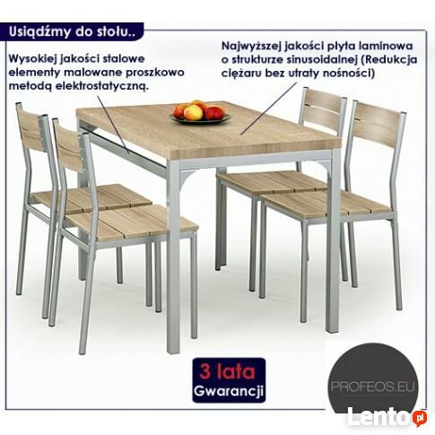 Cenisz sobie użyteczność i elegancję mebli, które dodają Twemu wnętrzu prawdziwego uroku? Sprawdź ofertę firmy Profeos i zobacz pokaz najnowszego zestawu Torino (Stół + 4 krzesła). Wyobraź sobie już dziś jak efektownie prezentowałyby się w Twoim wnętrzu... Niezwykły, unikalny design marki Profeos. Elegancja, wdzięk i jakże modny ostatnio minimalizm to cechy najnowszego zestawu Torino i pokusa nie tylko dla Twojego oka..Komfortowy Zestaw Torino wyróżnia się nie tylko swoją unikalną formą ale także zastosowaniem materiałów najlepszej jakości. To dlatego cieszy się on powodzeniem wśród osób lubiących ciekawe rozwiązania. Użyta do blatu stołu oraz krzeseł płyta laminowana MDF została uszlachetniona i pokryta cienkimi filmami melaminowymi. Posiada także specjalne włókna ułożone różnkokierunkowo o strukturze sinusoidalnej, co zapewnia nadanie jej cech jakościowych oraz wytrzymałościowych. Designerski blat wykonany został ze specjalnej płyty komórkowej, której główną zaletą jest redukcja ciężaru bez utraty stabilności oraz innych funkcji konstrukcyjnych. Nowy zestaw Torino jest z pewnością praktyczny i elegancki.