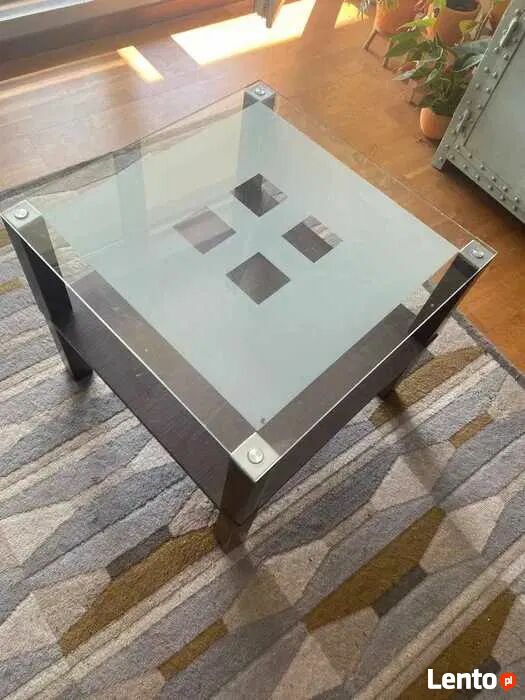 Do sprzedania uroczy stolik kawowy, idealny do salonu w kolorze drewna wenge/czekolady. Szkło, częściowo matowe stanowi górną półkę. Dolna półka drewniana. Stan: dobry. Lekko ukruszony róg.Wymiary blatu: 55 x 55cm. Wysokość: 50cm.