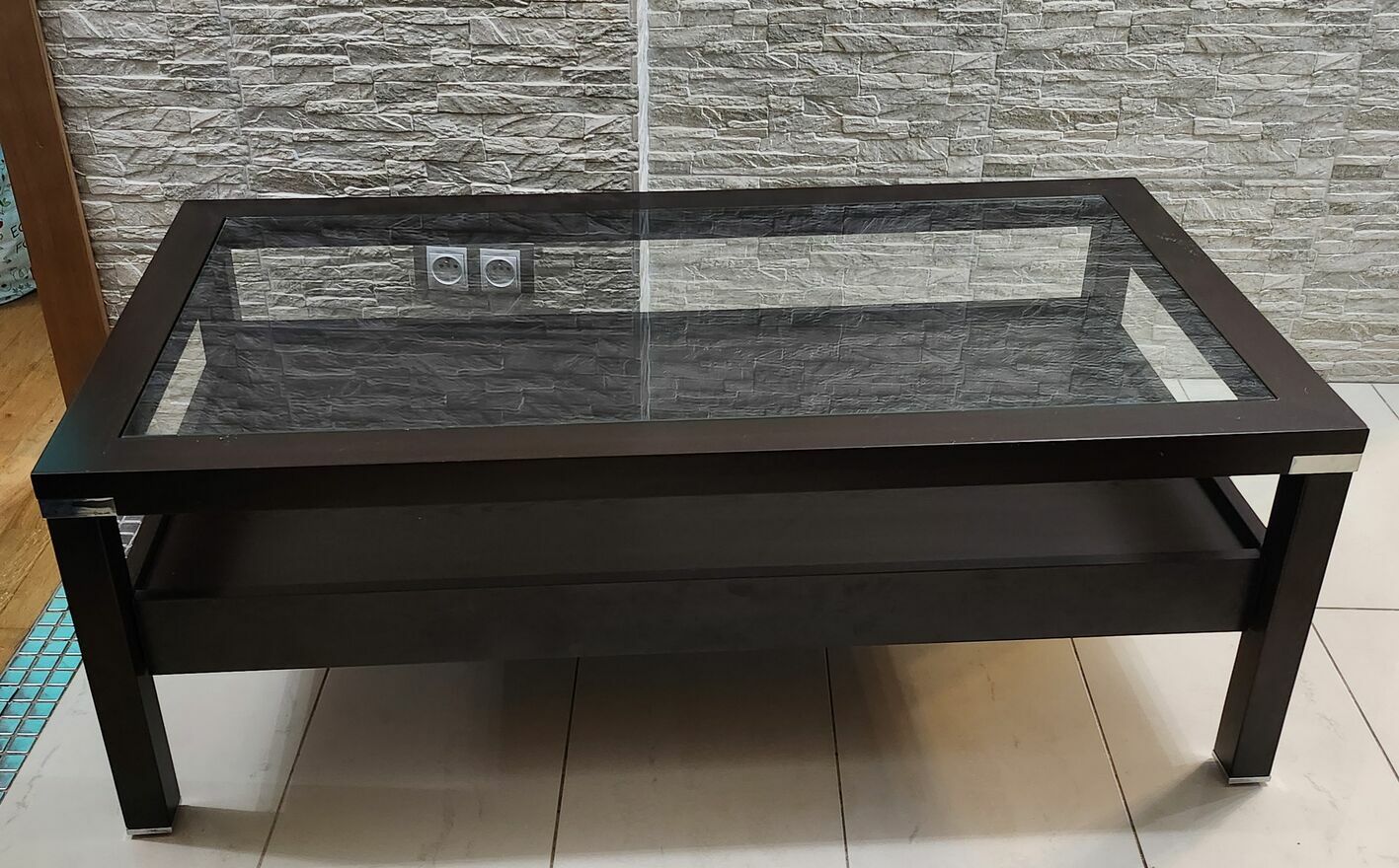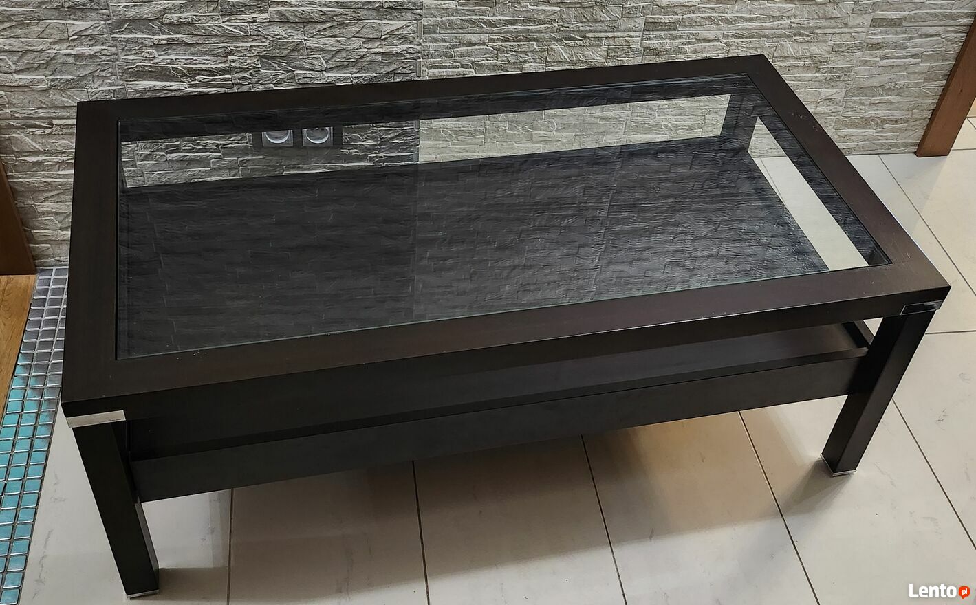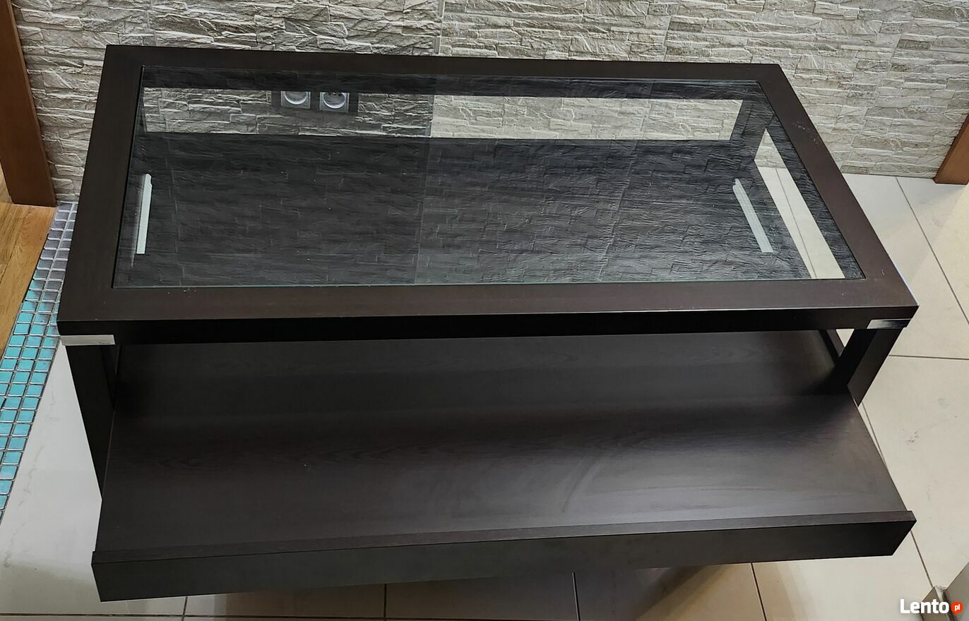 "ogłoszenie widoczne = AKTUALNE"Red aple stolik kawowy ze schowkiem, wysuwanym dolnym blatem. Górny blat ze szkła. Kolor venge. Wymiary 120 x 63,5 cm, wysokość 44 cm. Stolik ze śladami użytkowania ale bez pęknięć, złamań itp.