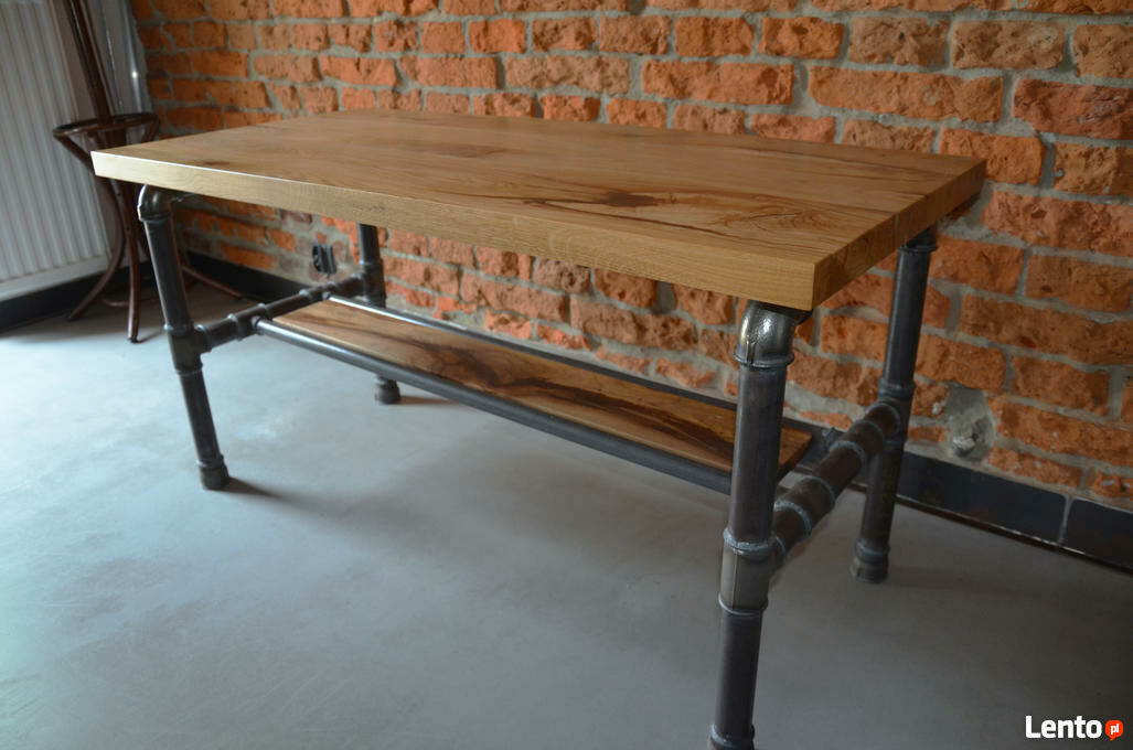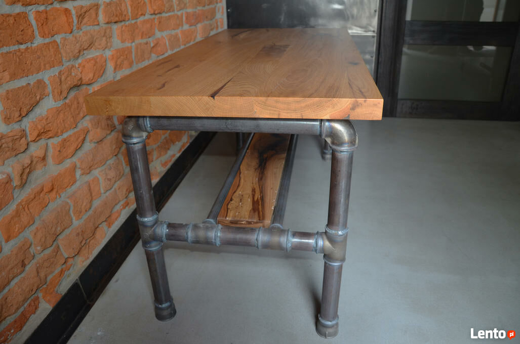 Surowy metal oraz nie wyszlifowane spawy łączące rury z kolankami nadają stolikowi loftowego klimatu.
