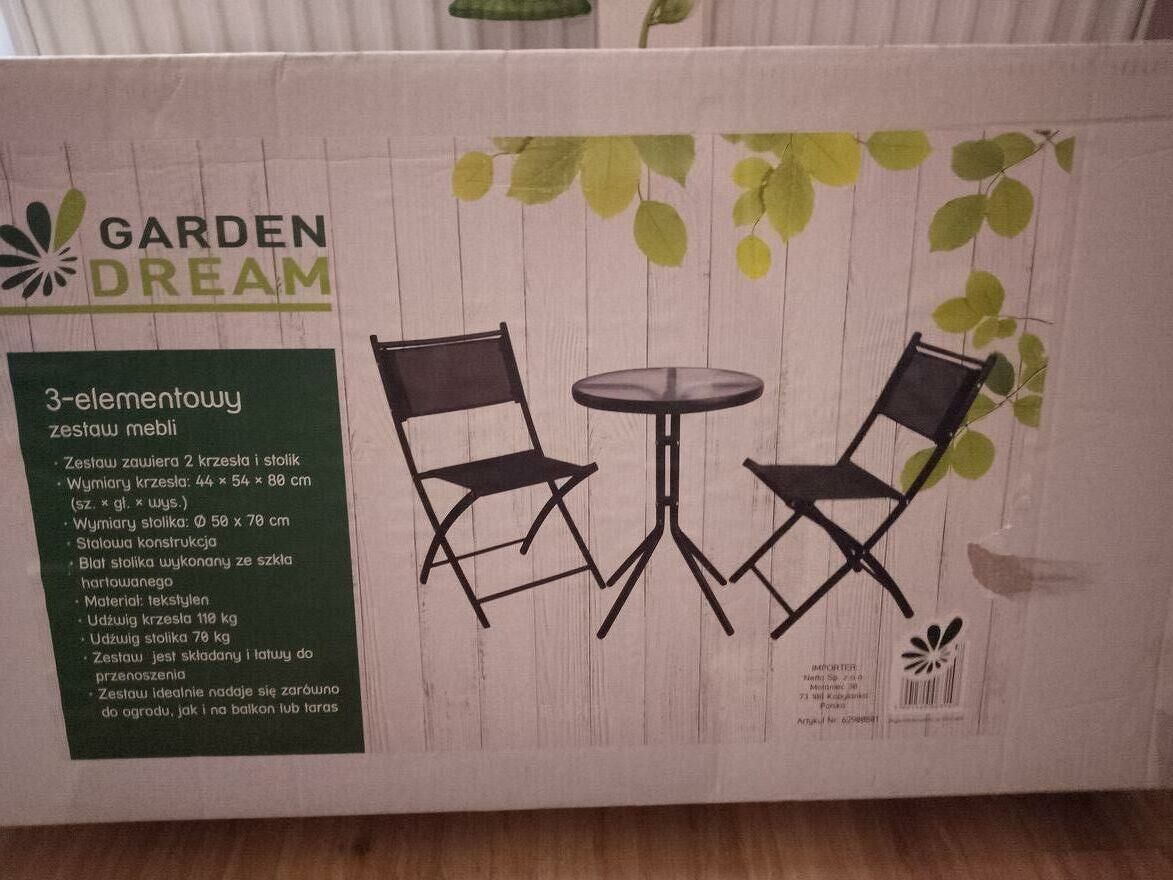 Sprzedam Stolik z dwoma krzesełkami na balkon lub taras. Nowy cena 220 zł .Odbiór osobisty płatne gotówką.