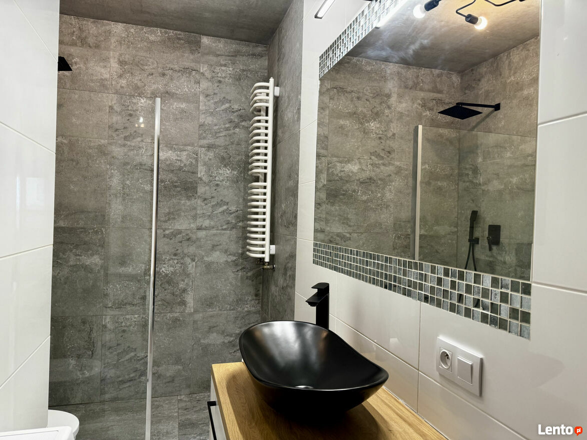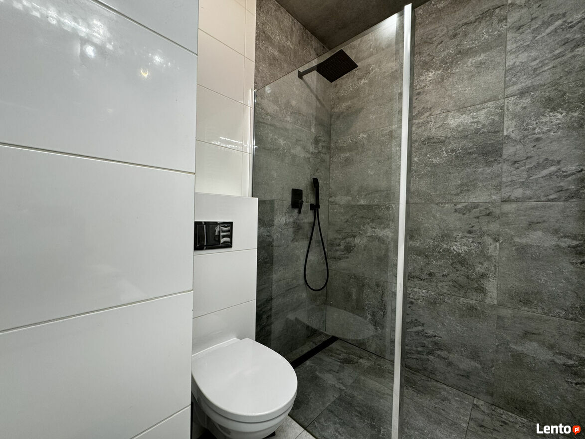 W łazience znajduje się umywalka, duży prysznic i pralka. W mieszkaniu znajduję się również stół jadalny, krzesła, barek, ogromna szafa na ubrania przy głównym wejściu, TV (smart TV), komoda oraz rozkładana kanapa w salonie.