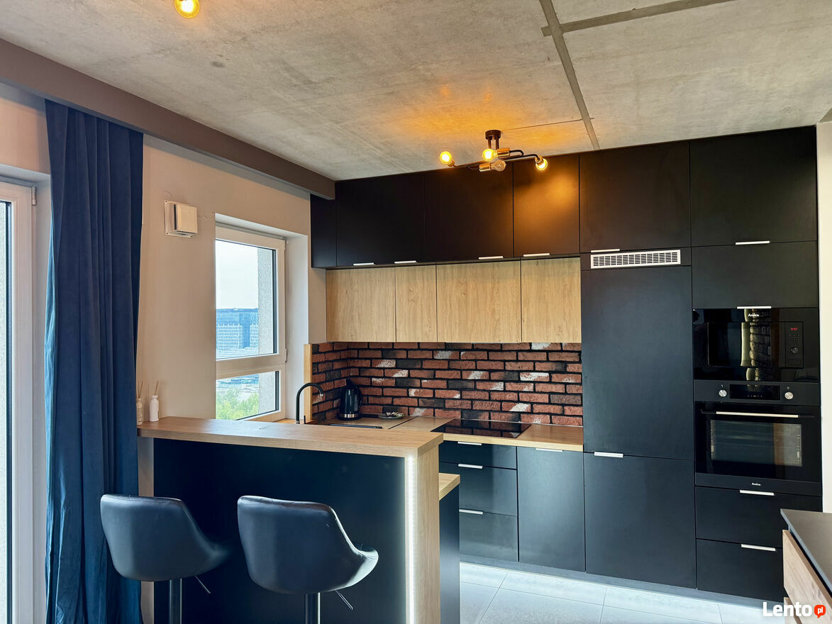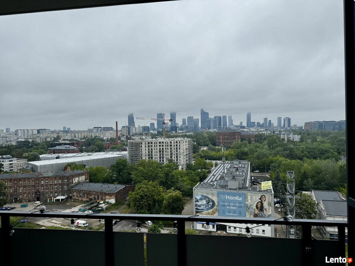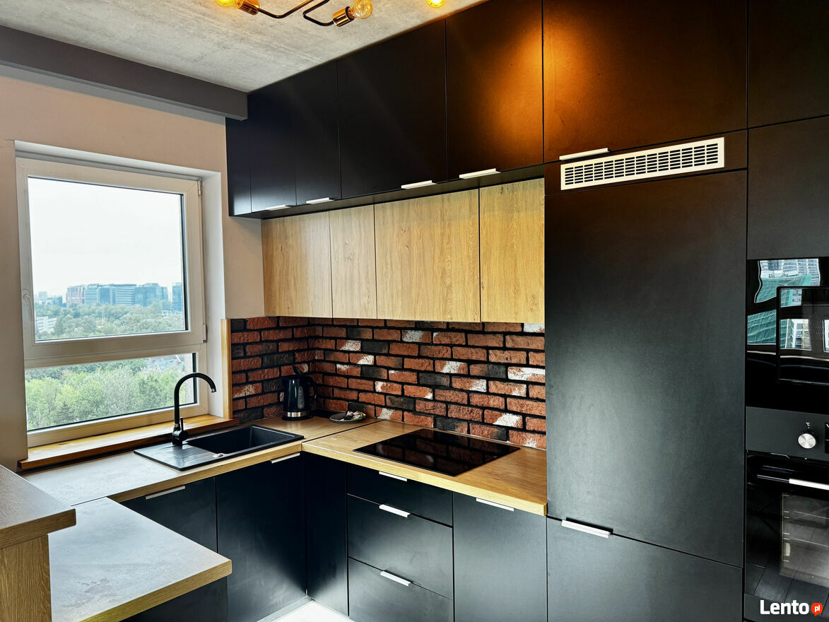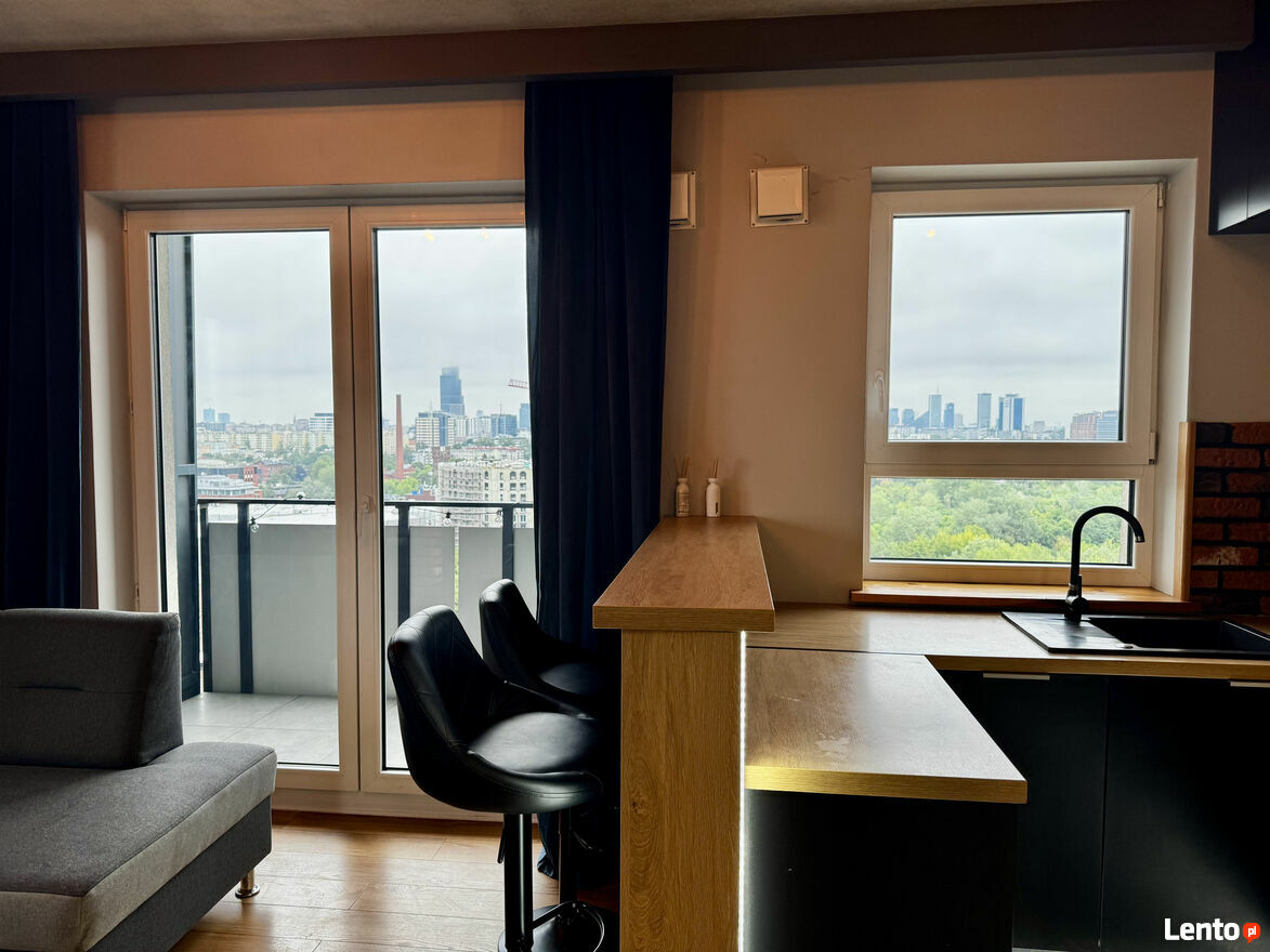 A fully furnished 2-room apartment located on the 14th (top) floor of the Parki Warszawy investment at Stańczyka 2. The apartment is finished to a high standard, featuring custom-made furniture, a bathroom with a walk-in shower, a double bed, and a velour sofa. The apartment is clean and freshly completed.