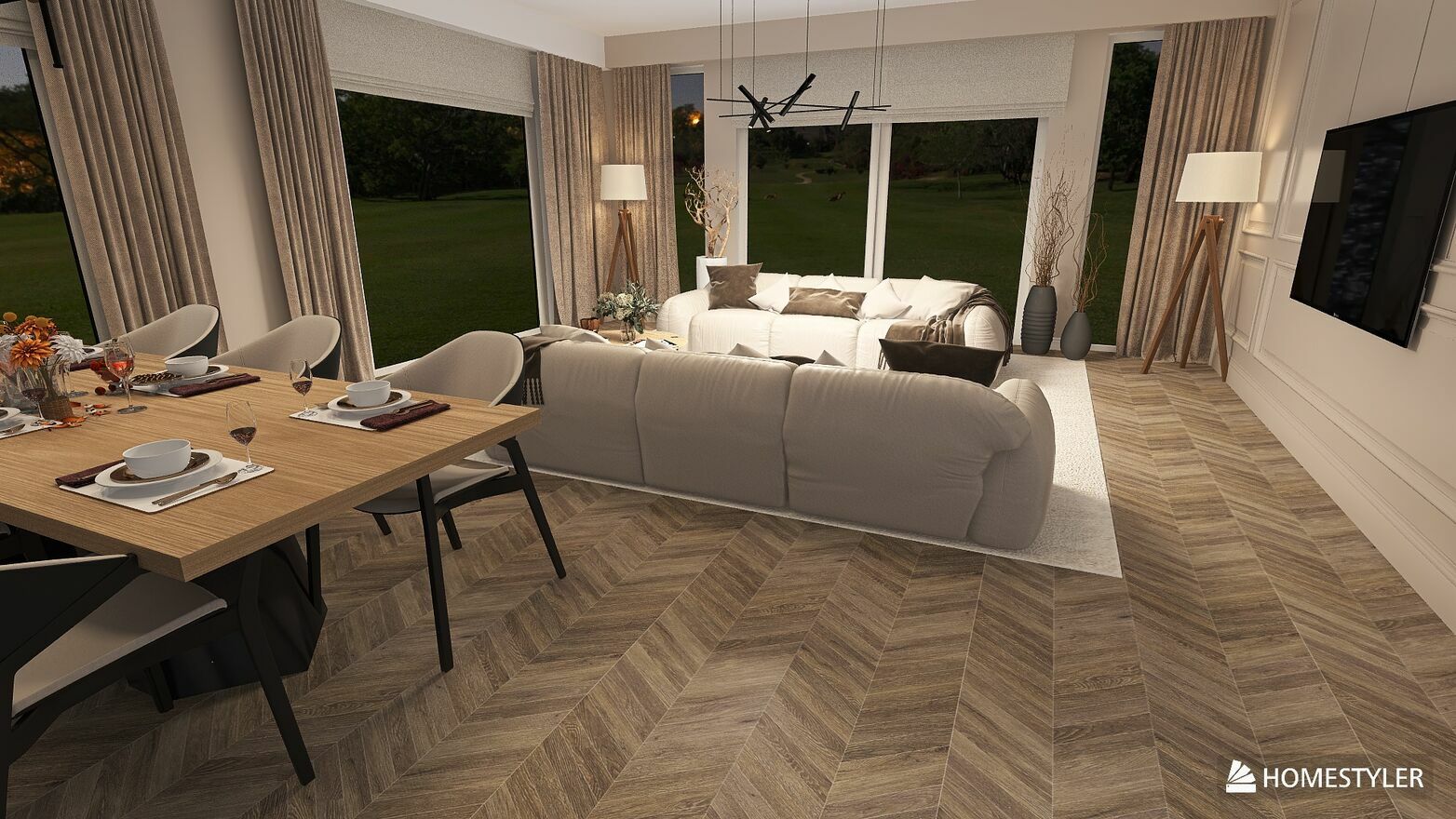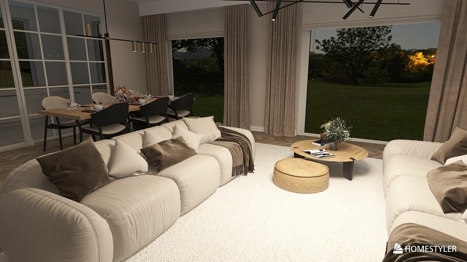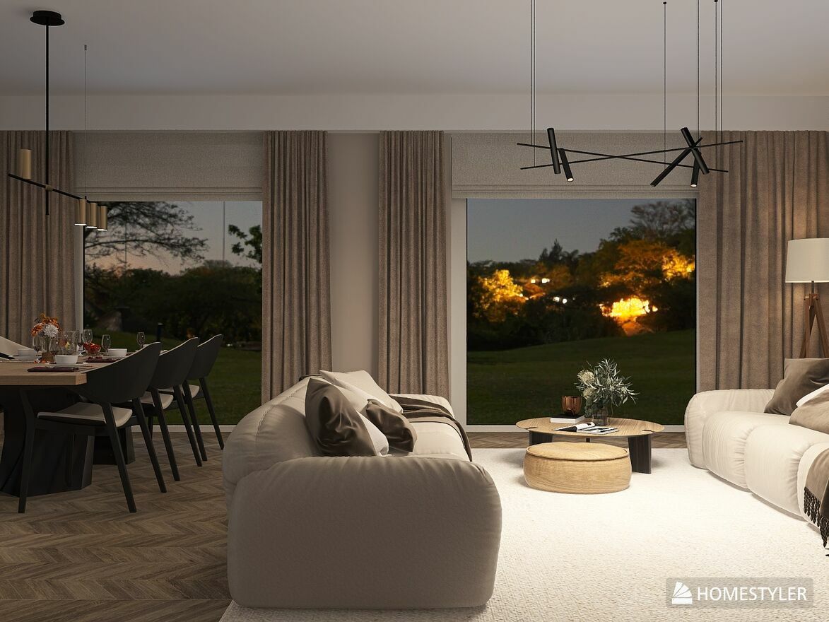 Garaż planowany jako osobny budynek na działce (by nie zabierać słońca od południa). Parter to 200m2 z wysokimi kondygnacjami, dużymi oknami, kominkiem w salonie. Na działce drzewa – wysoki brzozy, tworzące mały, przytulny zagajnik od strony salonu.