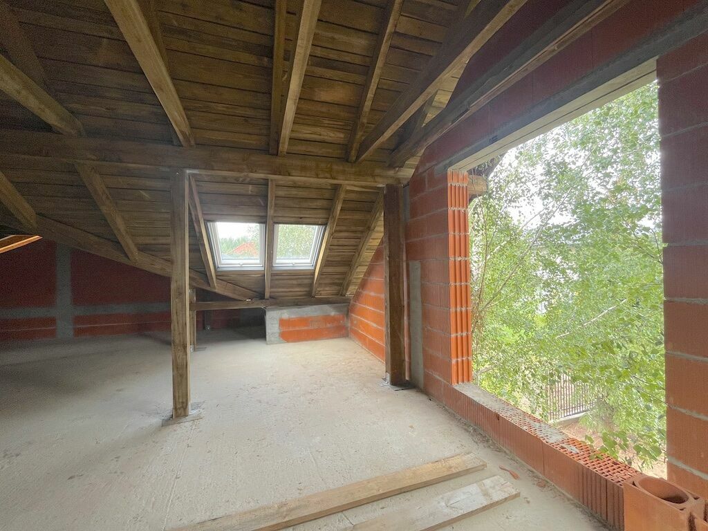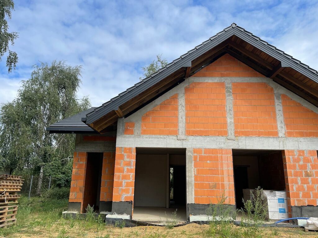 Realizacja od początku postawiona na jakość – dom wykonany z najlepszych materiałów, budowany dla siebie. Zakończony stan surowy otwarty z zakończonym dachem: czyli wykonano wszystkie ściany wraz z wewnętrznymi oraz dach, który został pokryty dachówką ceramiczną. Piwnica jest żelbetowa w technologii białej wanny czyli zupełnie odporna na wodę, gdyby wystąpiła oraz ciepła - docieplona od zewnątrz w gruncie 15 cm Styrodurem. Ściany z Wienerberger Porotherm 25 cm, wewnętrzne cegła silikatowa firmy Silka. Więźba dachowa – Modrzew klasa C24 + pełne deskowania z modrzewia + 2 x papa + dachówka ceramiczna Meyer Holzen (Mercedes wśród dachówek, 30 lat gwarancji).