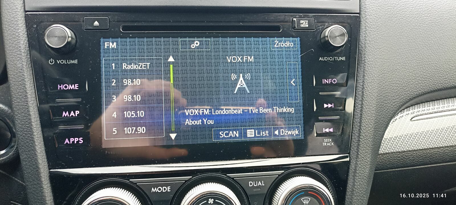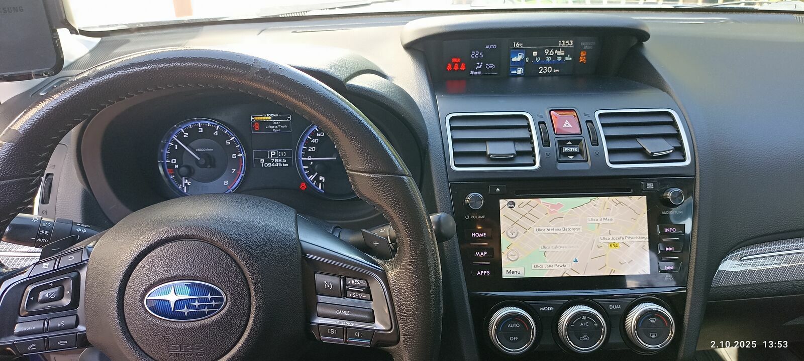 Subaru Levorg 1.6 GT-S AWD 2016 rok (model fo face lifting-u) Silnik benzynowy 4-cylindrowy boxer 1.6 turbo 170KM EURO 6 EyeSight - Aktywny tempomat oraz system bezpieczeństwa AWD Simmetrical - stały napęd 4x4 CVT Lineatronic - automatyczna bezstopniowa skrzynia biegów SI-DRIVE - dwa tryby pracy układu napędowego (Individual i Sport) BLIS - system monitorowanie martwego pola TPMS - czujniki ciśnienia w kołach VDCS - system kontroli trakcji i stabilizacji toru jazdy PAKIET ADVANCED HBA - Asystent świateł drogowych SRVD - asystent cofania AVH - automatyczne uruchamianie hamulca postojowego ATV - aktywne sterowanie momentem napędowym Bi-LED lampy skrętne (SRH) + spryskiwacze Bluetooth zestaw głośnomówiący Nawigacja 7" m.in. PL DAB radio cyfrowe Keyless Access - System bezkluczykowy Kamera cofania Podgrzewane fotele Klimatyzacja automatyczna 2-strefowa Kierownica skórzana wielofunkcyjna z łopatkami do zmiany biegów Niebieskie obszycie foteli, kierownicy, deski, boczków drzwi Podwójne wydechy SHL stal nierdzewna Przyciemnione tylne szyby Regulowane oparcie tylnej kanapy dzielone 40:20:40
