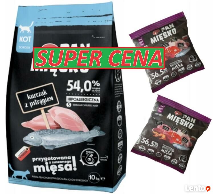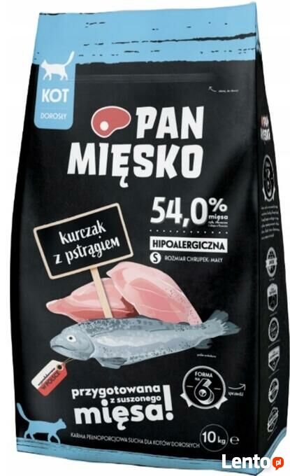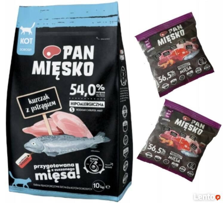 PAN MIĘSKO KARMA DLA KOTA KURCZAK PSTRĄG S 10kg+ 2 losowe próbki Pan Mięsko 50g dla Kota