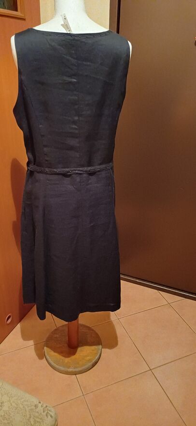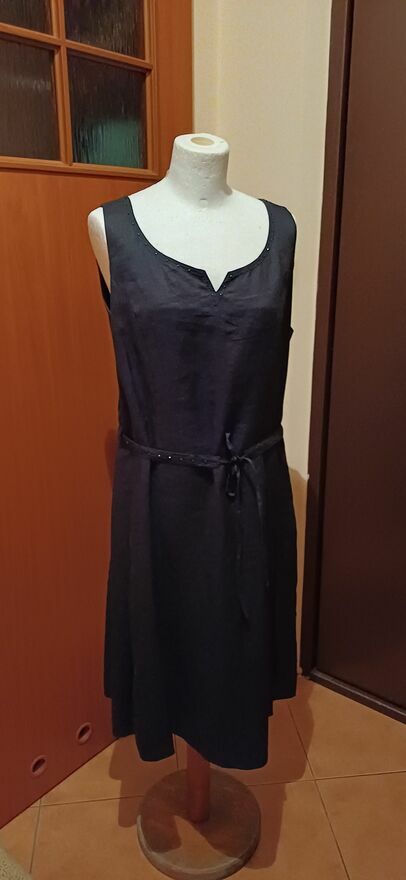 Nowa czarna sukienka z lnu 100 %, idealna na różne okazje. Wykonana z wysokiej jakości materiału, na podszewce,doskonała propozycja dla kobiet ceniących wygodę i styl. Miękki materiał idealny na upały,przewiewny, chłodzący.O oryginalnym kroju z cięciami wyszczuplającymi, nie odcinana w pasie.