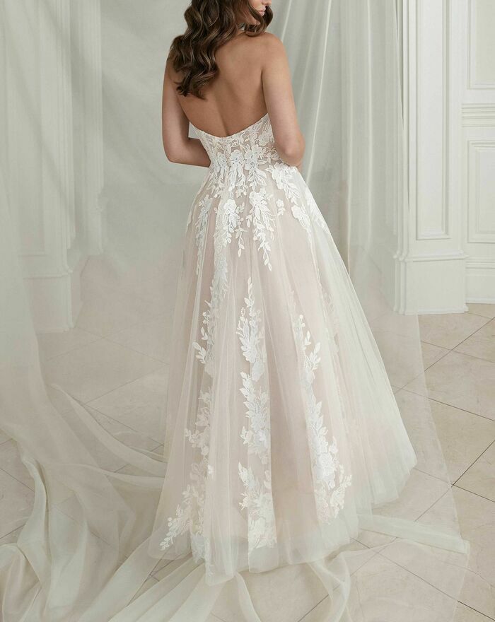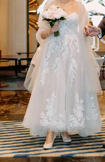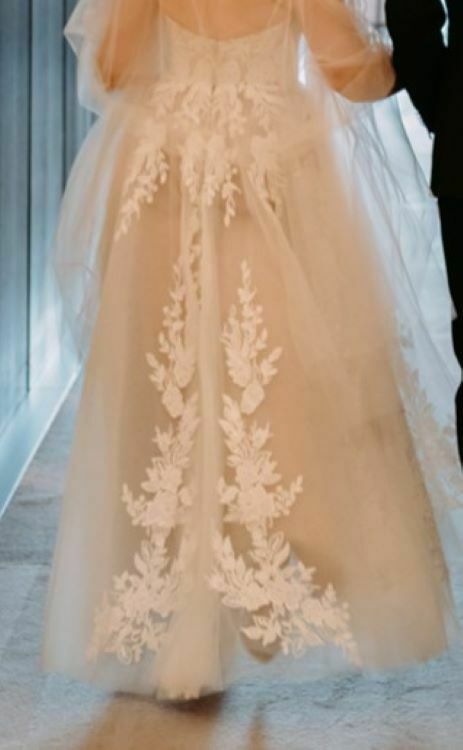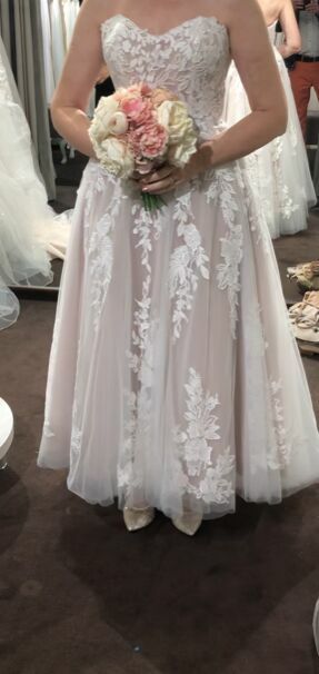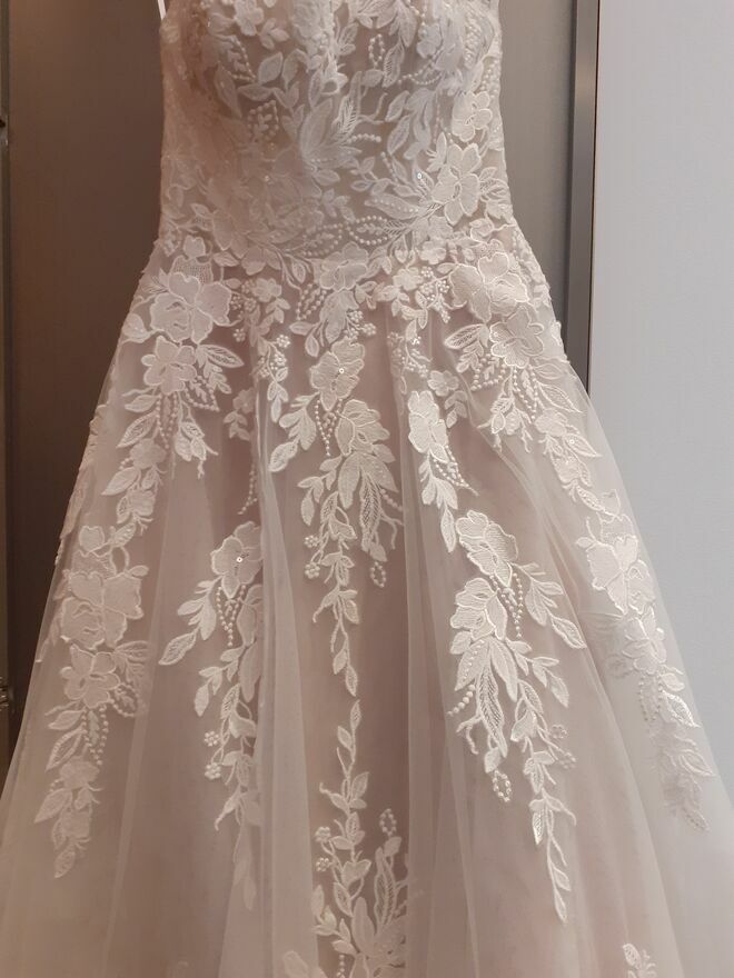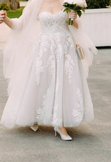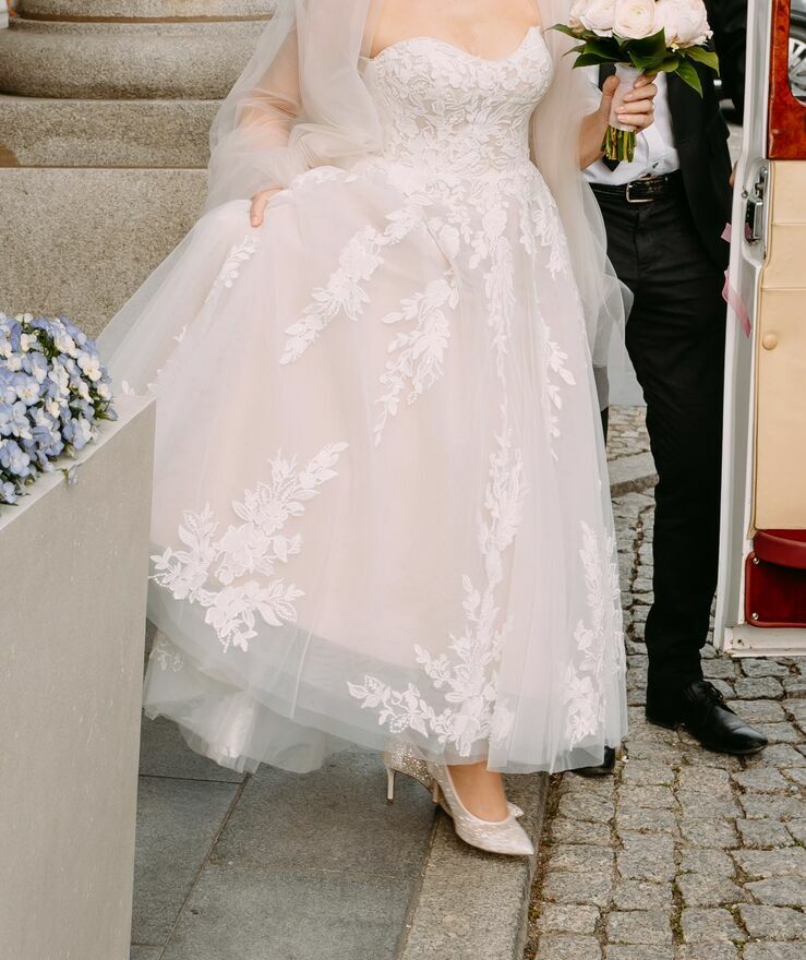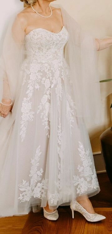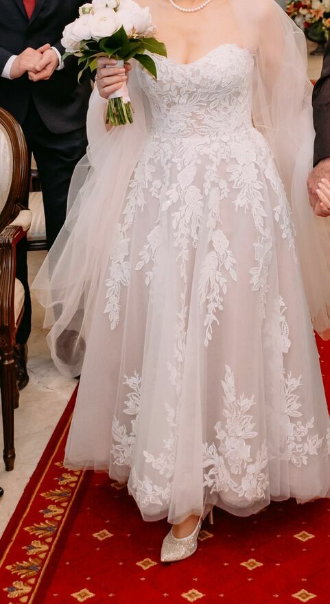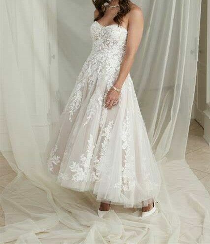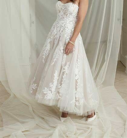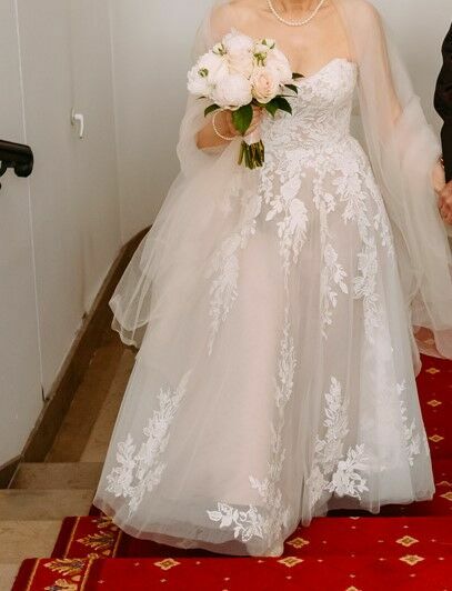 Suknia z amerykańskiej kolekcji Justin Alexander Signature 88255 style Ellie kupiona w Salonie WHITE w Warszawie. Zachwyciła wszystkich ! Elegancja, szyk, romantyzm. Pojawiając się przed gośćmi usłyszałam : « Wyglądasz zjawiskowo ... » Tak, zdecydowanie czułam sie w tej sukni jak księżniczka. Można uznać, że jest nowa, miałam ja na sobie kilka godzin; Z przodu troszkę krótsza tuż nad pantofelkami, z tyłu do ziemi. Naszyta koronka przechodzi z gorsetu w dół sukni, to istna maestria, gdzie niegdzie mieni się diamencikami; Jest na kilku warstwach tiulowych, kolor jednej z halek bardzo lekko karmelowy co podkresla biel koronki. Piękny szal z jedwabnego tiulu identyczny jak pierwsza warstwa sukni, w prezencie. Jesli masz nr buta 36, urocze pantofelki z diamencikami też w prezencie. Rozmiar sukni 36/38. Mój wzrost 158. Cena jest bardzo przystępna zważywszy na wyjatkową jakość i styl sukni zaprojektowanej przez wysokiej rangi stylistę. W salonie zapłaciłam 5990 zl . Dokumenty zakupu do wglądu.Dagmara