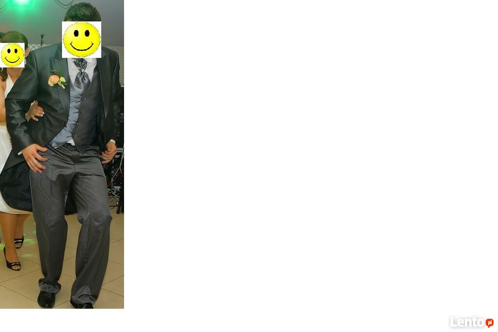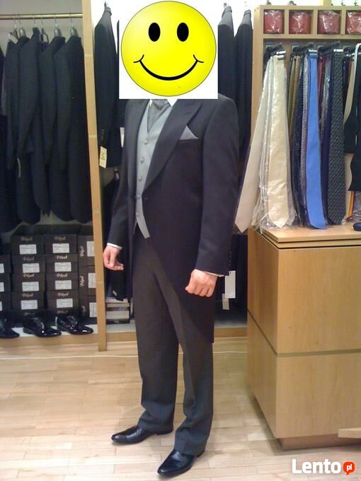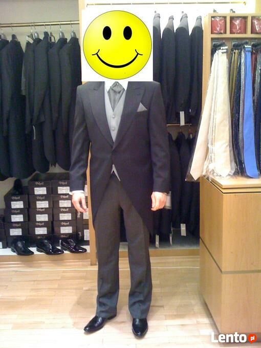 Grafitowy gładki męski żakiet o zaokrąglonej i wydłużonej ku tyłowi linii. Do niego nieco jaśniejsza szara kamizelka i sztuczkowe spodnie w prążki. Komplet został zakupiony w Salonie „Biały Raj” w Warszawie.