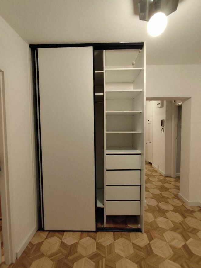 Duży przedpokój z dwiema ogromnymi szafami do wspólnego użytku