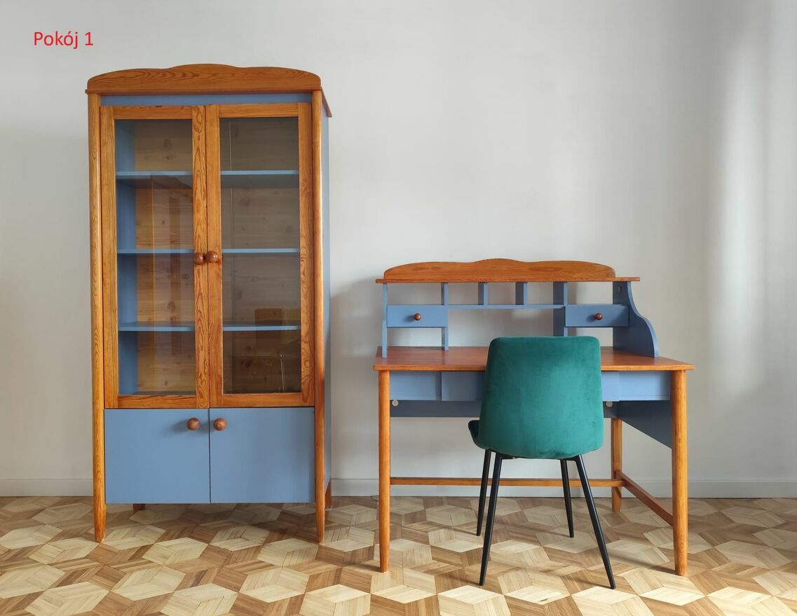 Duża stylowa witryna, biurko z nadstawką, krzesło, lampka nocna, rozkładana kanapa z poduszkami, szafa, mała szafeczka z półkami. Pow. 33,18 m².