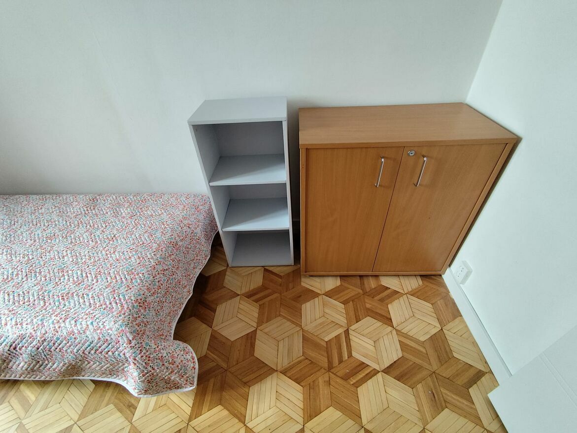 Dwie szafy, biurko, krzesło obrotowe, lampka nocna, łóżko z nowym materacem (IKEA), mała szafka z półkami i szafka z drzwiczkami. Pow. 9,6 m².