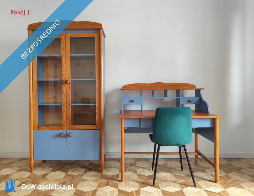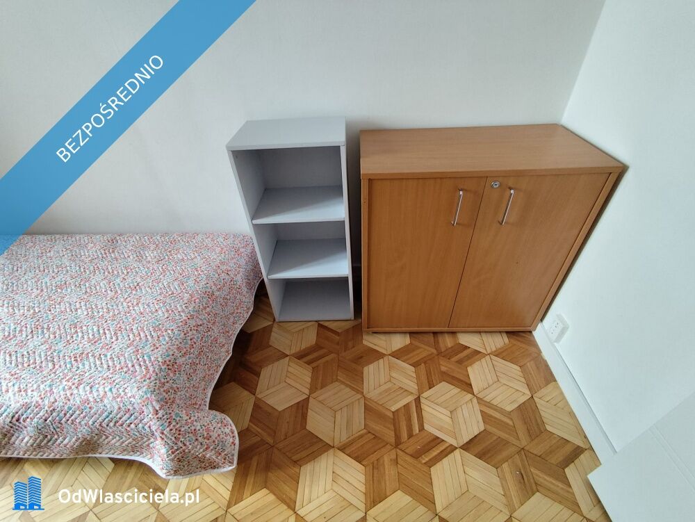Dwie szafy, biurko, krzesło obrotowe, lampka nocna, łóżko z nowym materacem (IKEA), mała szafka z półkami i szafka z drzwiczkami. Pow. 9,6 m²,